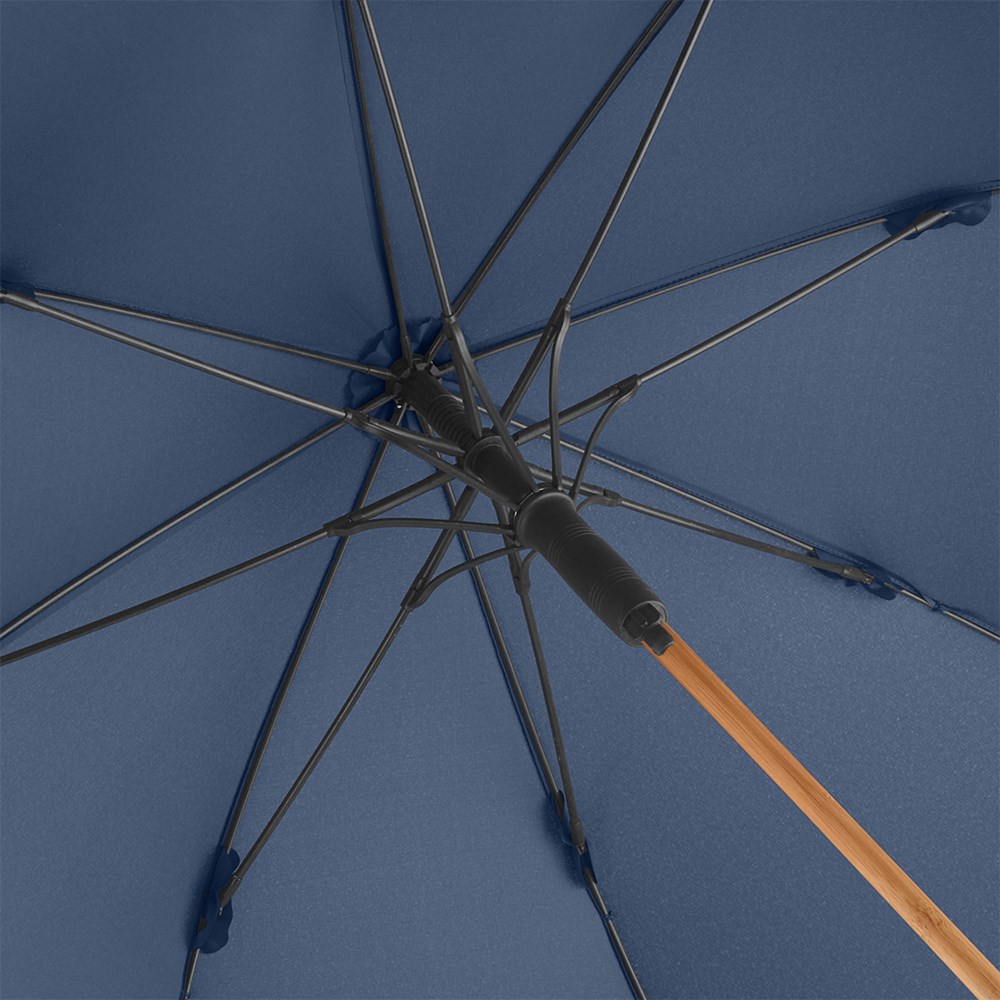 Nachhaltiger Stockschirm in mittlerer Größe mit Elementen aus Bambus und Bezug aus recycelten Kunststoffen Komfortable Automatik-Funktion zum schnellen Öffnen, hochwertiges Windproof-PLUS-System für eine maximale Gestell-Flexibilität bei stärkeren Windböen, flexible Fiberglasschienen, leichter Bambusstock, Polyester-Pongee Bezugsmaterial aus recycelten Kunststoffen, farbabhängig auch mit waterSAVE® Bezugsmaterial erhältlich, mit waterSAVE®-Label auf dem Schließband, Bambus-Spitzen, gerader Bambusgriff mit schwarzer Auslösetaste und Werbeanbringungsmöglichkeit. Auch als Taschenschirm (Art. 5429) erhältlich.