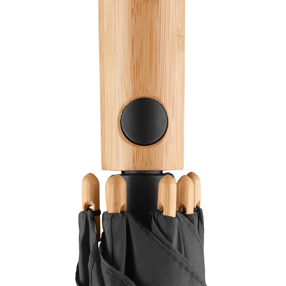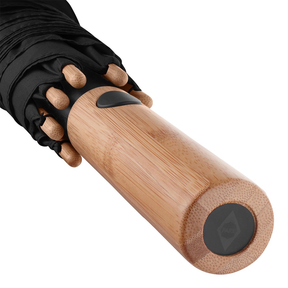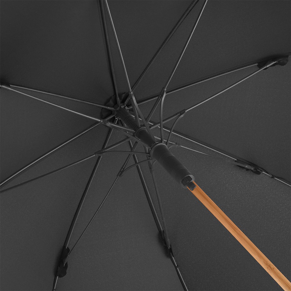 Nachhaltiger Stockschirm in mittlerer Größe mit Elementen aus Bambus und Bezug aus recycelten Kunststoffen Komfortable Automatik-Funktion zum schnellen Öffnen, hochwertiges Windproof-PLUS-System für eine maximale Gestell-Flexibilität bei stärkeren Windböen, flexible Fiberglasschienen, leichter Bambusstock, Polyester-Pongee Bezugsmaterial aus recycelten Kunststoffen, farbabhängig auch mit waterSAVE® Bezugsmaterial erhältlich, mit waterSAVE®-Label auf dem Schließband, Bambus-Spitzen, gerader Bambusgriff mit schwarzer Auslösetaste und Werbeanbringungsmöglichkeit. Auch als Taschenschirm (Art. 5429) erhältlich.