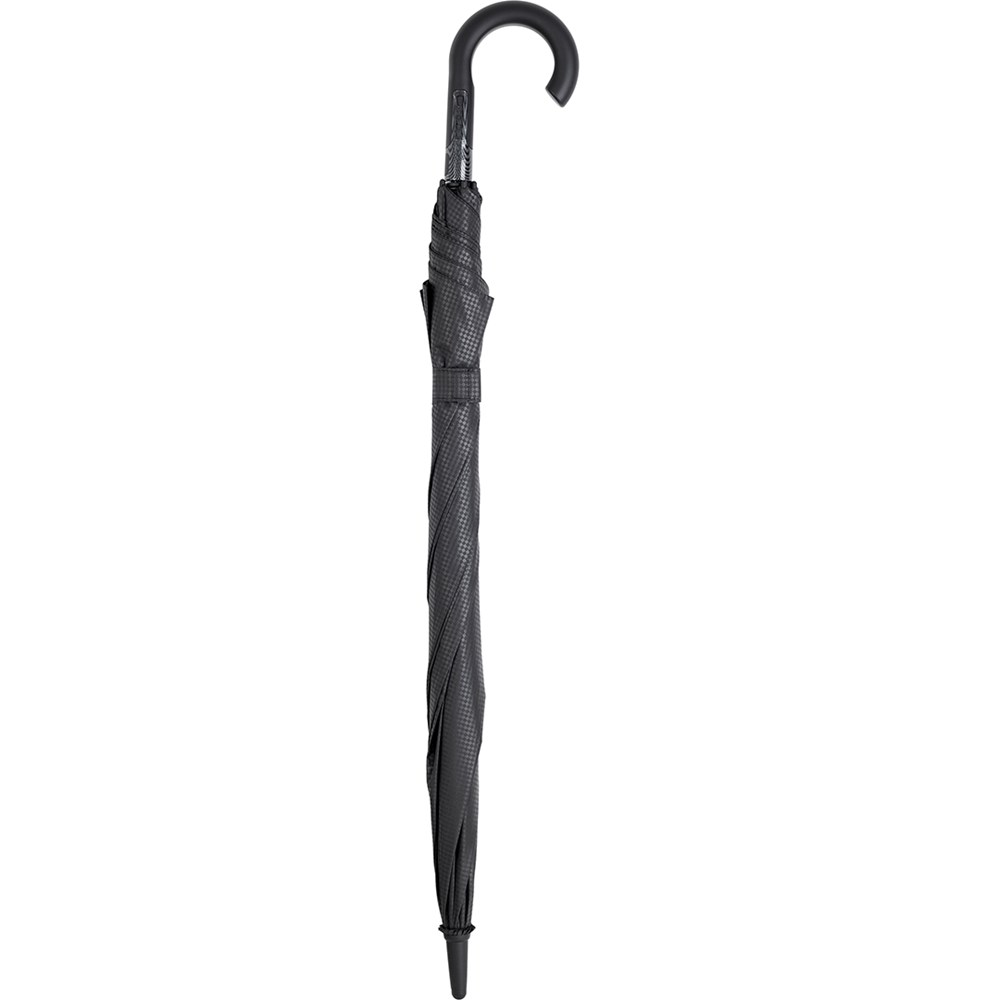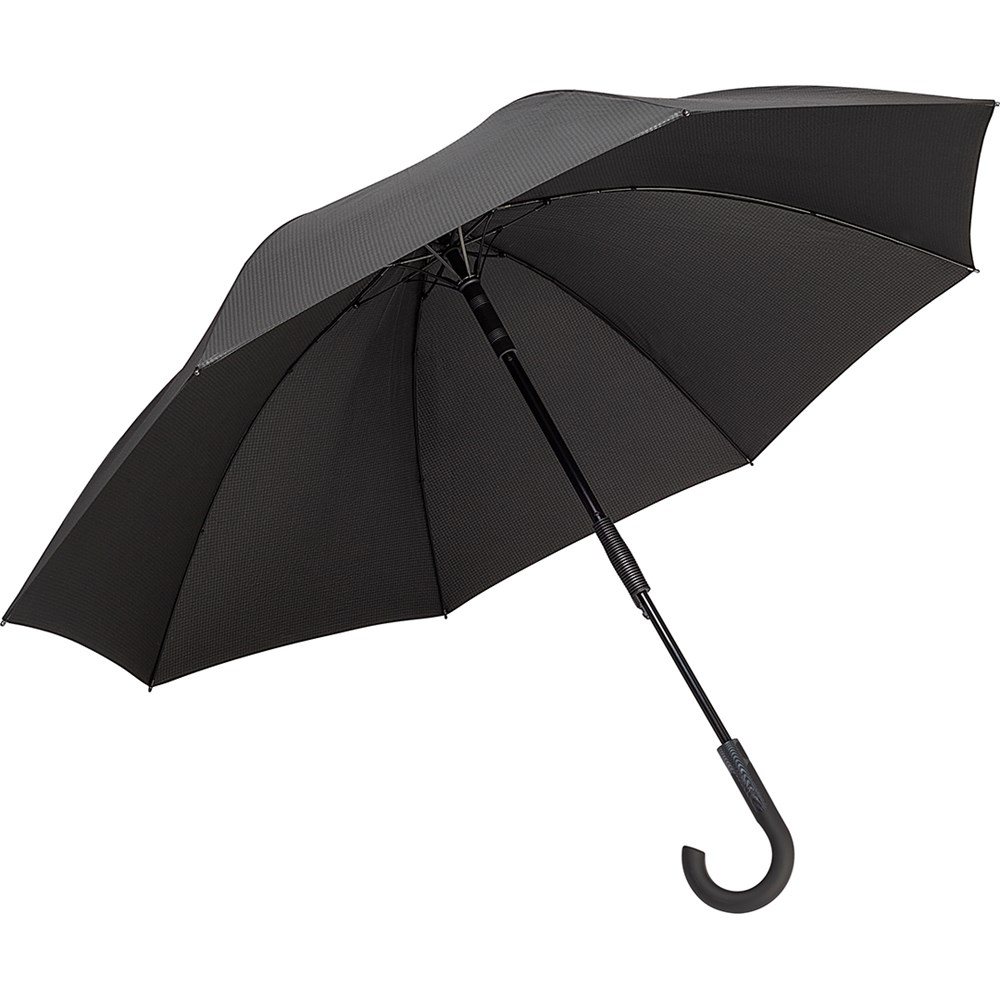 Stylischer Automatik-Gästeschirm für zwei Personen mit verkürztem Schließmechanismus und Griff in edler Carbon-Optik Komfortable Automatik-Funktion zum schnellen Öffnen, hochwertiges Windproof-PLUS-System für eine maximale Gestell-Flexibilität bei stärkeren Windböen, flexible Fiberglasschienen, stabiler Stahlstock mit verkürztem Schließmechanismus zum komfortableren Schließen, wassersparend gefärbtes Polyester-Pongee waterSAVE® Bezugsmaterial aus recycelten Kunststoffen, mit waterSAVE®-Label auf dem Schließband (bei neuen Chargen), Bezug in edlem Ton-in-Ton Caro-Dessin, stylischer Soft-Touch-Rundhakengriff mit Details in Carbon-Optik, Auslösetaste und Werbeanbringungsmöglichkeit