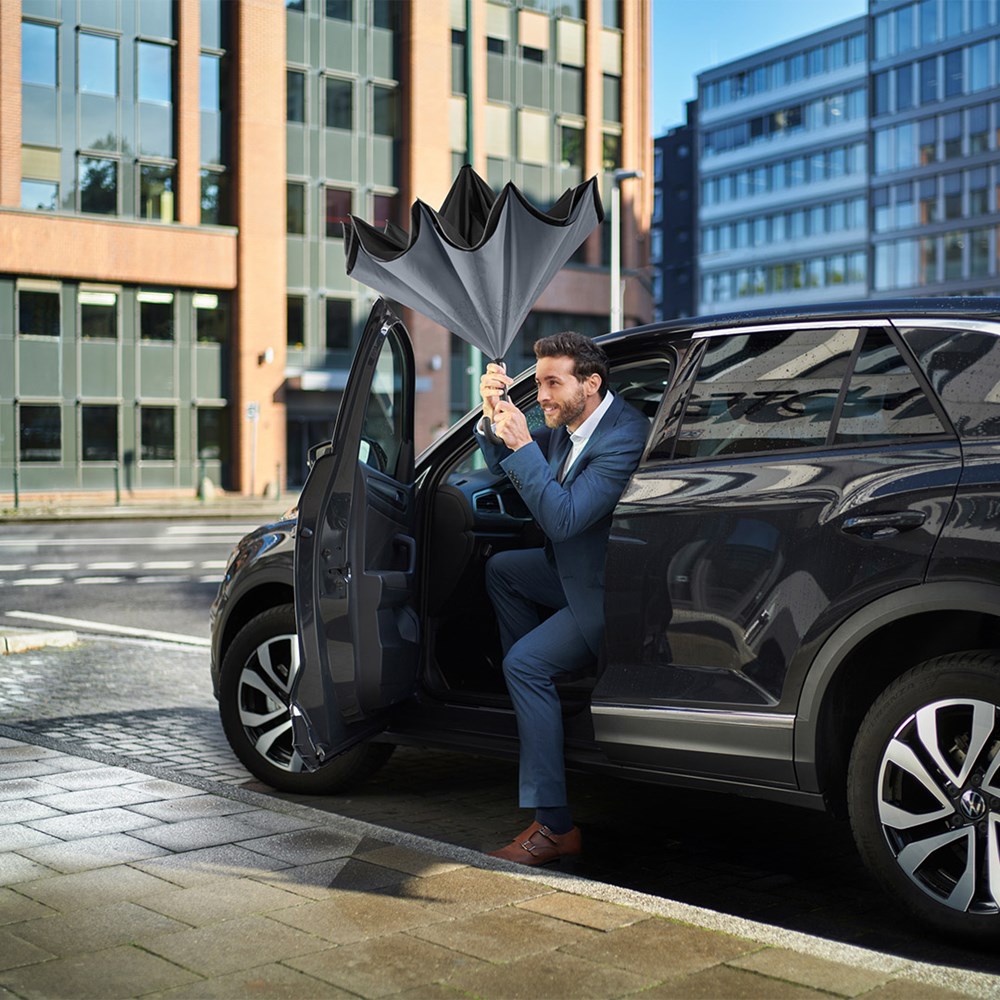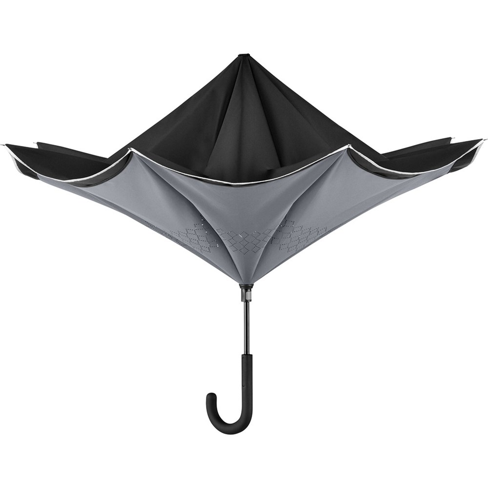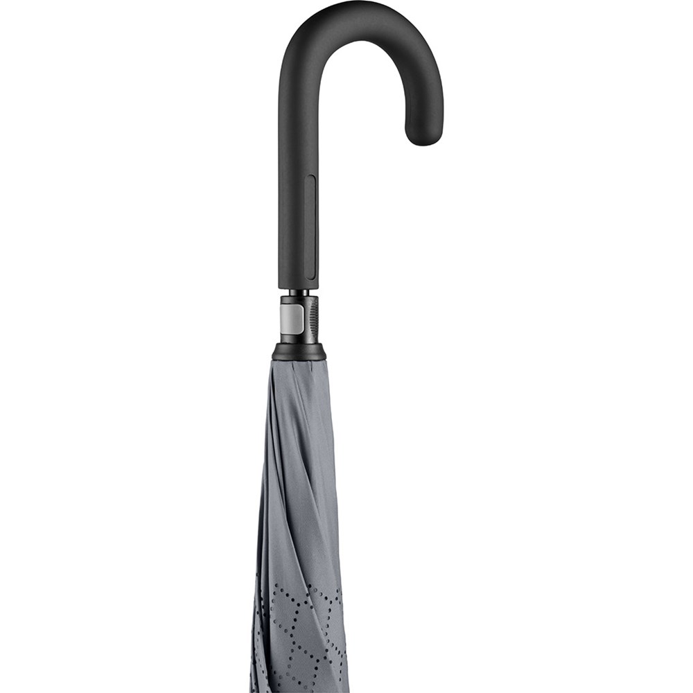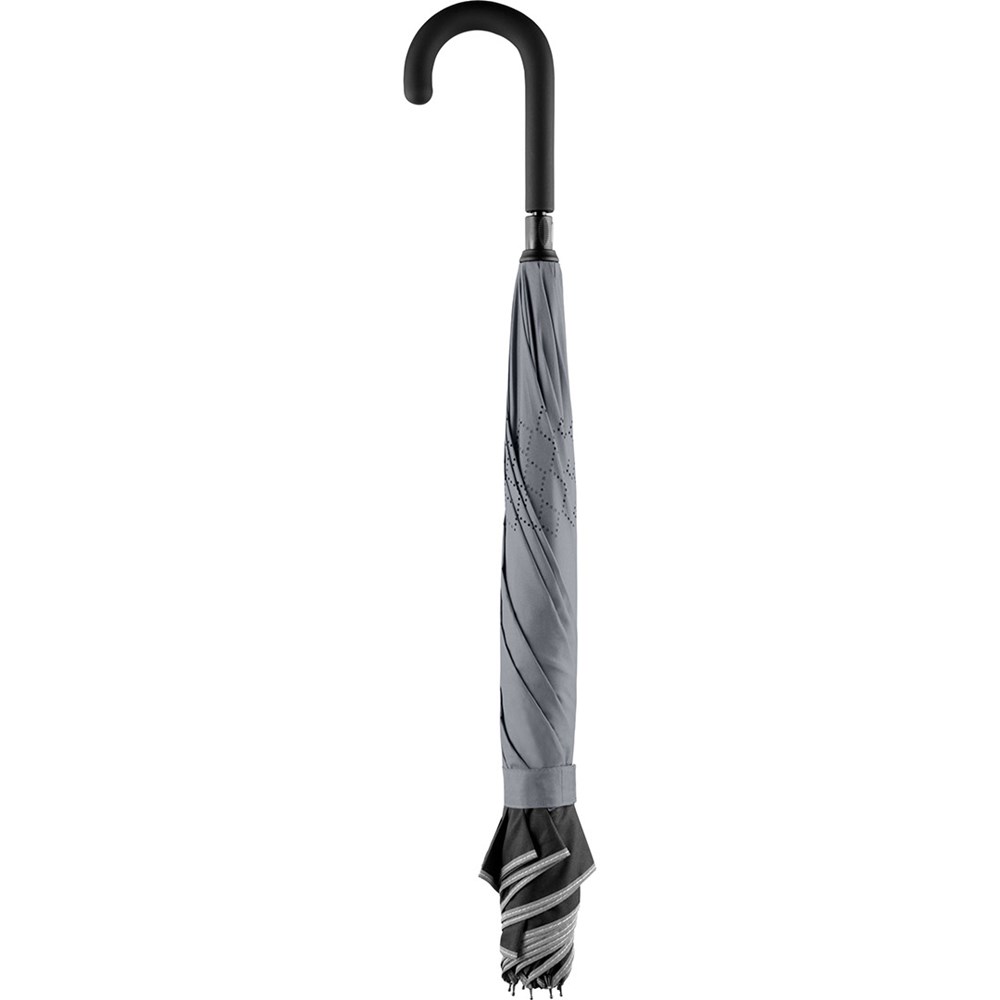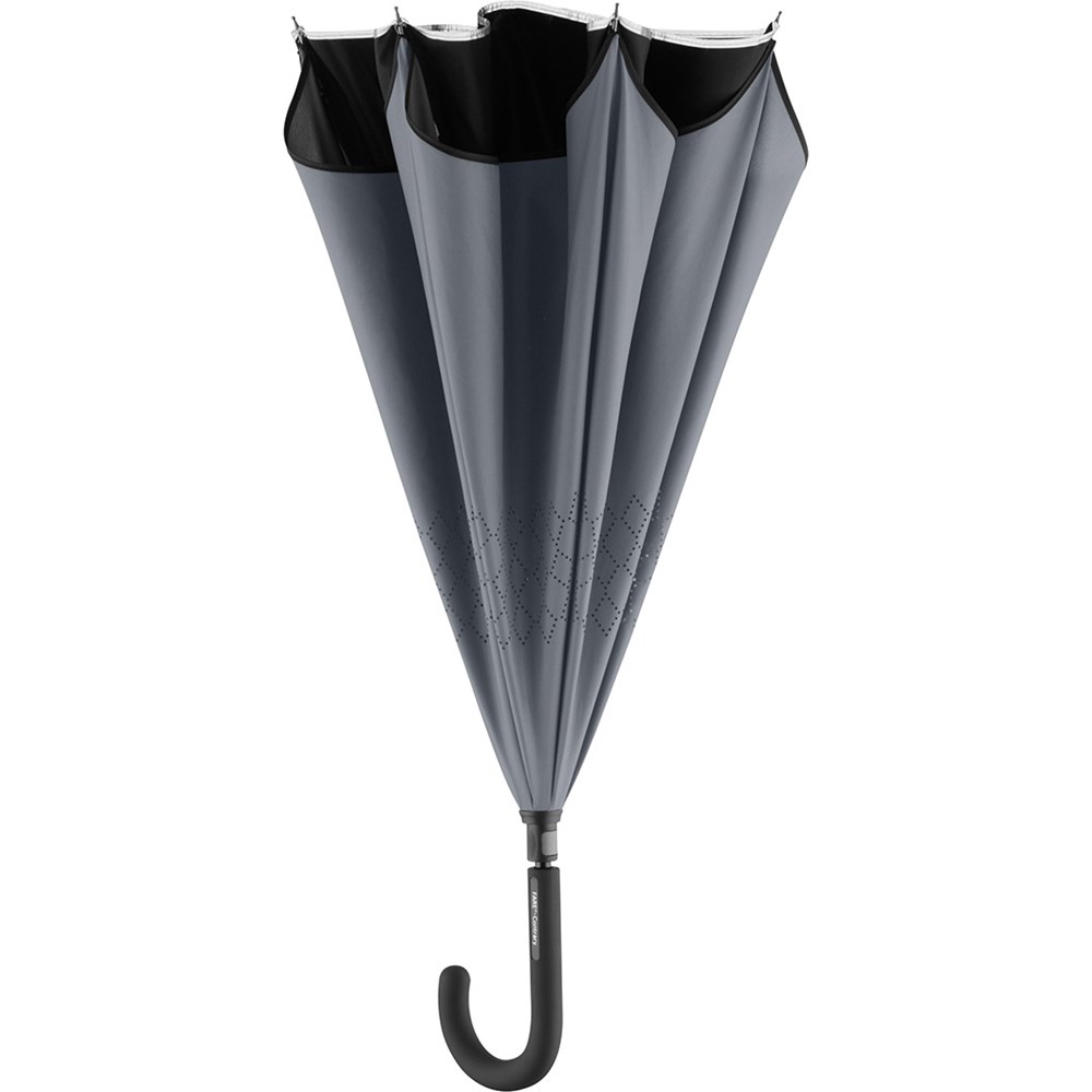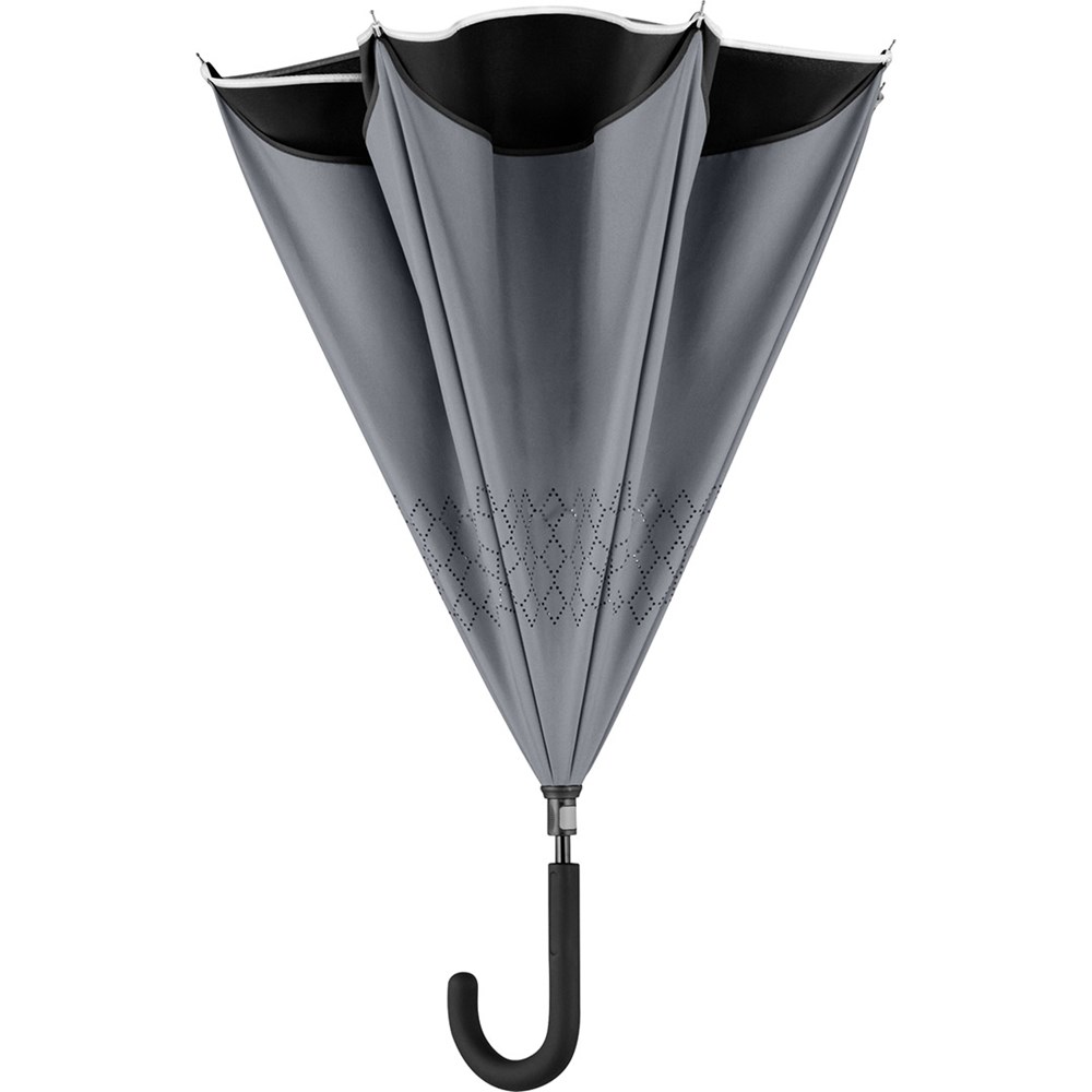 Trendiger Stockschirm mit umgekehrtem Öffnungs- und Schließmechanismus Einfache Handhabung durch Sicherheitsschieber, hochwertiges Windproof-PLUS-System für eine maximale Gestell-Flexibilität bei stärkeren Windböen, von innen nach außen öffnendes Fiberglasgestell, flexible Fiberglasschienen, Doppel-Bezug mit gelasertem Ventilationsmuster zur Vermeidung von Luftstau, Bezug mit modischer Reflexpaspel in Silber, Soft-Touch-Rundhakengriff mit Werbeanbringungsmöglichkeit. Auch als Taschenschirm erhältlich (Art. 5415).