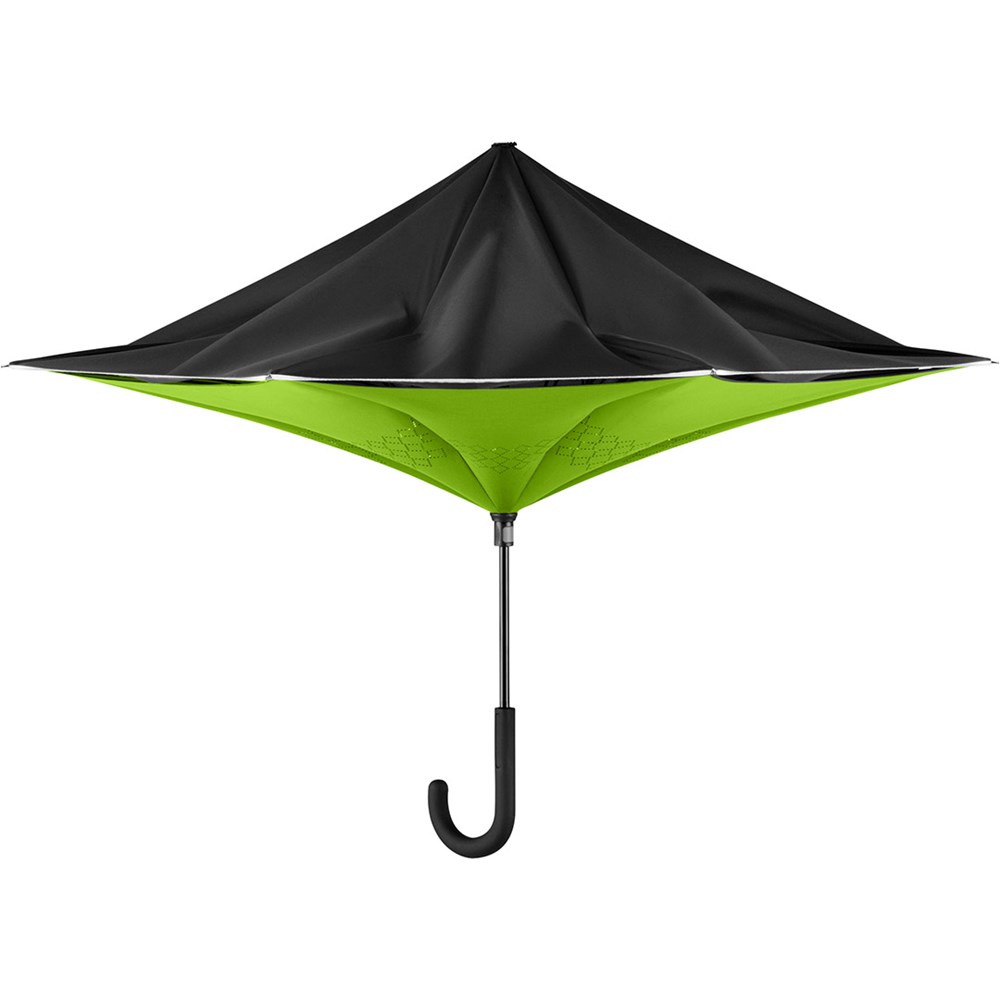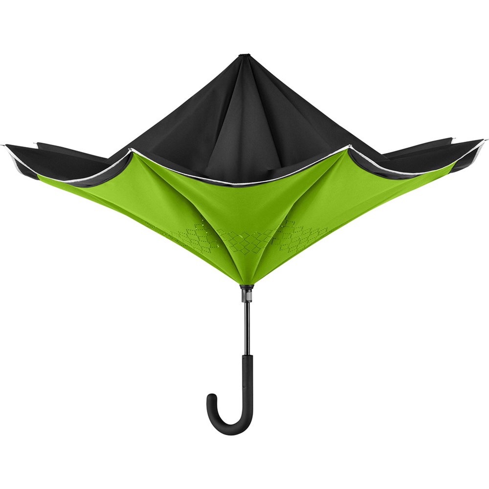 Trendiger Stockschirm mit umgekehrtem Öffnungs- und Schließmechanismus Einfache Handhabung durch Sicherheitsschieber, hochwertiges Windproof-PLUS-System für eine maximale Gestell-Flexibilität bei stärkeren Windböen, von innen nach außen öffnendes Fiberglasgestell, flexible Fiberglasschienen, Doppel-Bezug mit gelasertem Ventilationsmuster zur Vermeidung von Luftstau, Bezug mit modischer Reflexpaspel in Silber, Soft-Touch-Rundhakengriff mit Werbeanbringungsmöglichkeit. Auch als Taschenschirm erhältlich (Art. 5415).