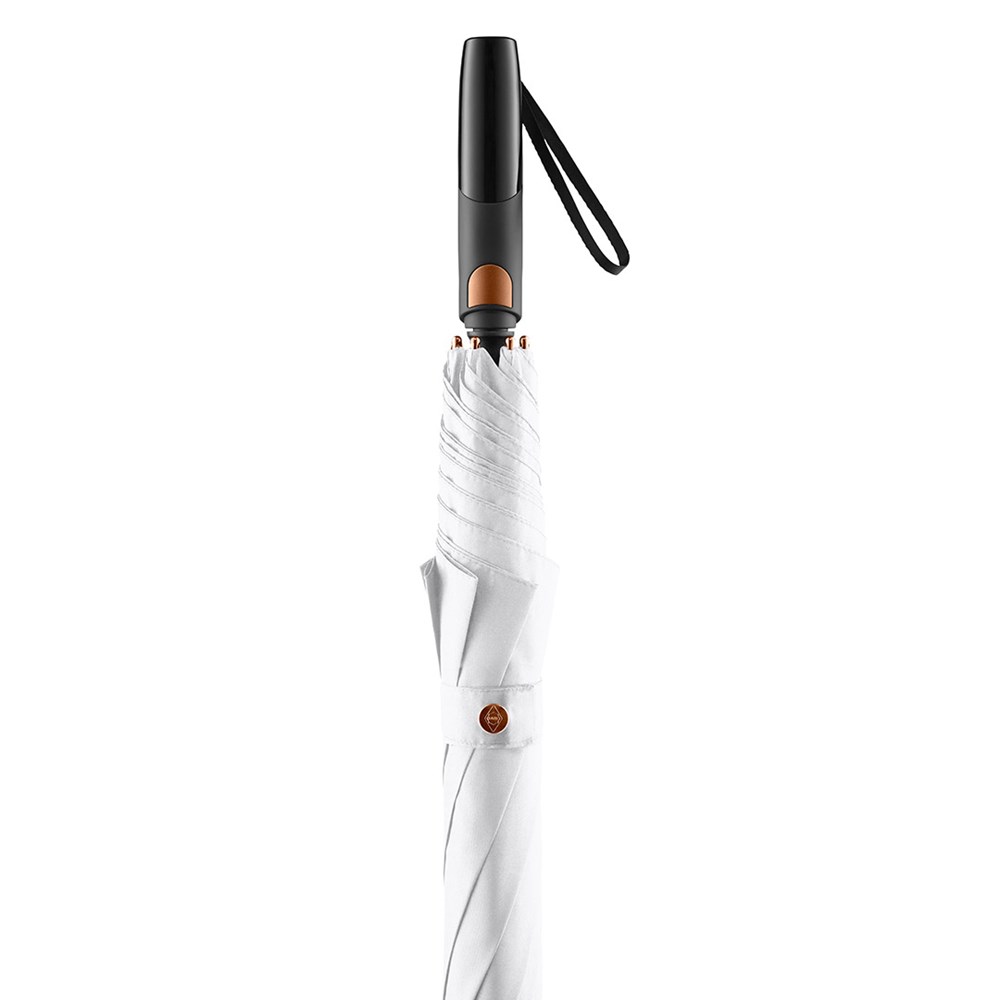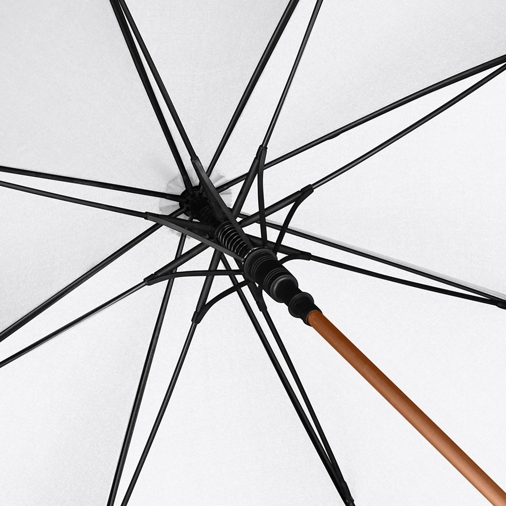 Edler Automatik-Gästeschirm für zwei Personen mit Elementen in Metallic-Farben Komfortable Automatik-Funktion zum schnellen Öffnen, hochwertiges Windproof-PLUS-System für eine maximale Gestell-Flexibilität bei stärkeren Windböen, flexible Fiberglasschienen, Aluminiumstock in matter Metallic-Farbe, Metall-Spitzen und Metall-Druckknopf am Schließband farblich passend zum Stock, matt/glänzend abgesetzter Soft-Feel-Griff mit integrierter Auslösetaste und Werbeanbringungsmöglichkeit