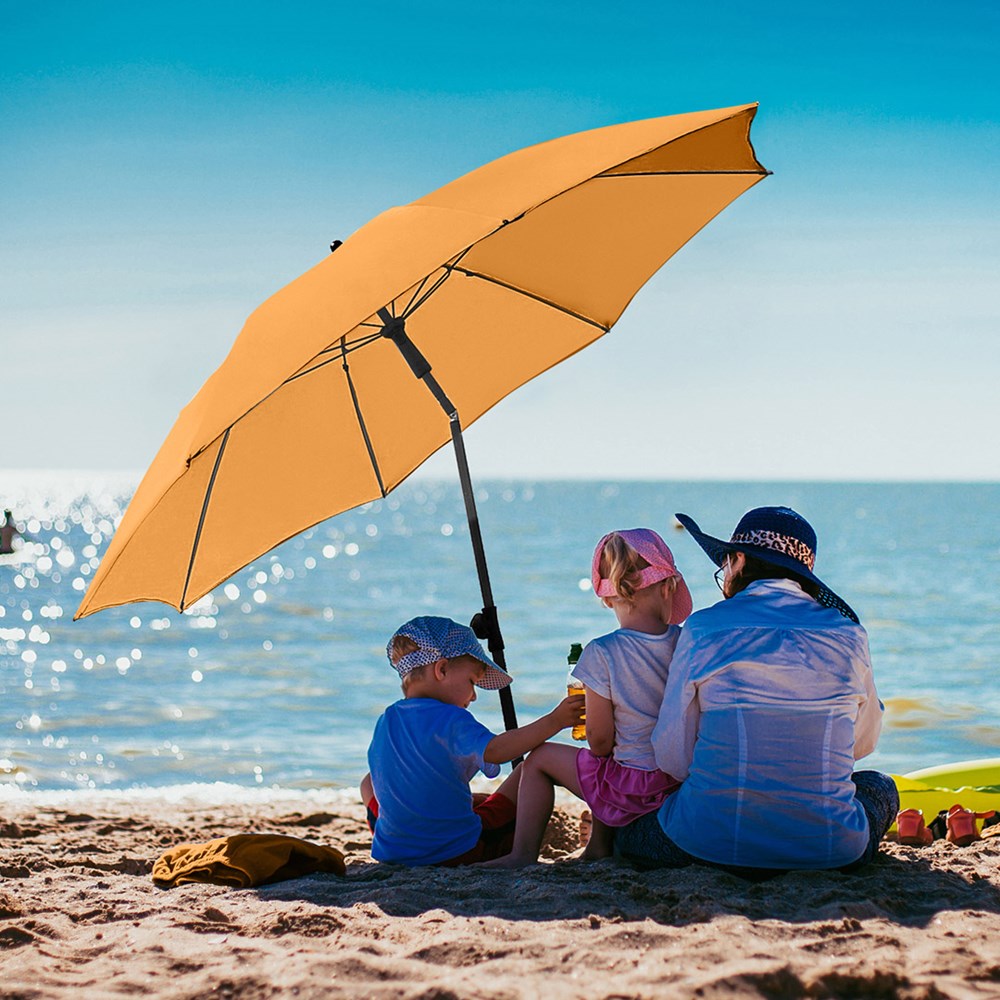 Moderner Sonnenschirm mit Gestell in Titan-Finish und Knickvorrichtung Einfache Handhabung durch Sicherheitsschieber, sehr stabile Fiberglasschienen, zweiteiliger und stufenlos höhenverstellbarer Stock mit Knickvorrichtung zur Neigung des Schirms, Stock in edlem Titan-Finish, Unterstock mit ca. 120 cm Länge und Drehfeststeller zur sicheren Fixierung, komfortables Tragefutteral, hochqualitativer Bezug mit einer Grammatur von ca. 200 g/m² und Lichtschutzfaktor UPF 50+, exklusive Füllständer (Art. 8920 oder Art. 8905) / Erdspieß (Art. 8939)