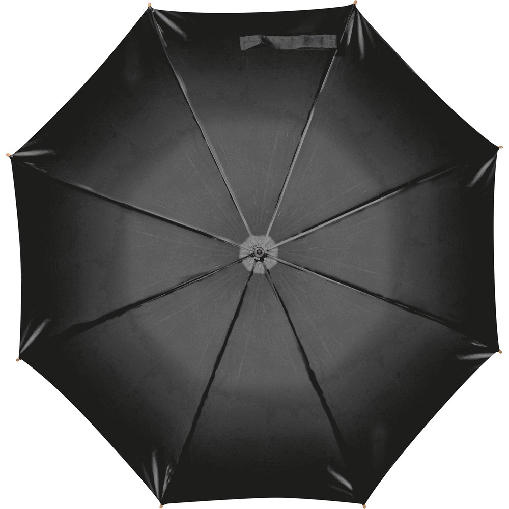 Automatikregenschirm aus 190T Polyester mit gebogenem Holzgriff und Holzspitzen. Die Werbung wird auf den unteren Teil eines Segments gedruckt.