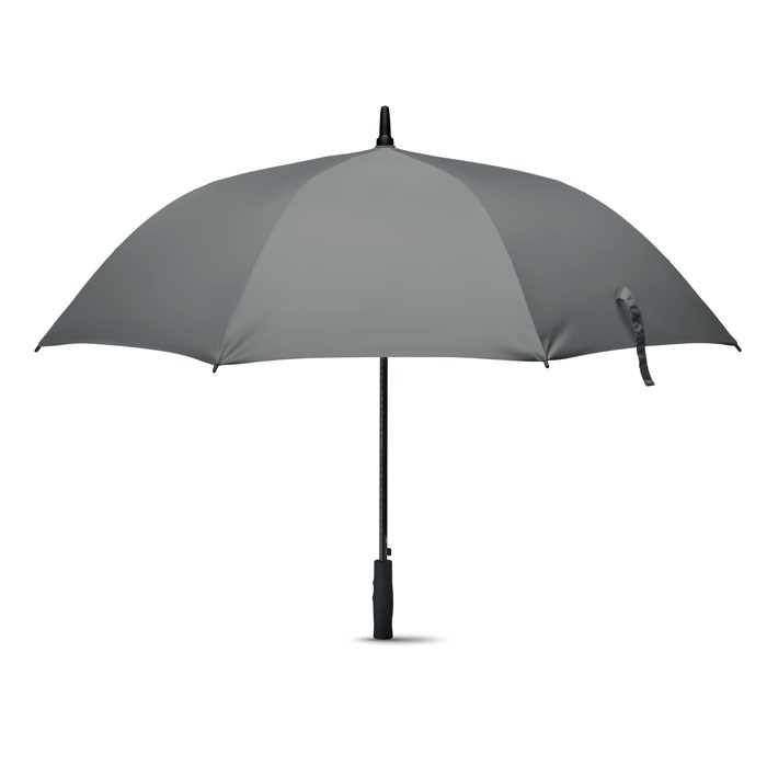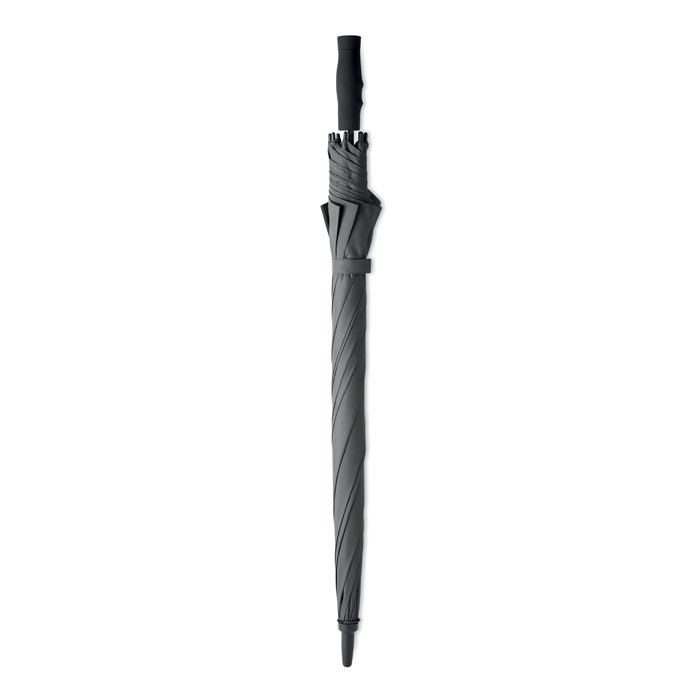 27'' Regenschirm aus 190T Pongee. Windbeständig. Stock und Stangen aus Fiberglas. Schwarze Krone und Spitzen aus Kunststoff. Schwarzer Griff aus ABS mit gummiertem Finish. Automatische Öffnung, manuelle Schließung.