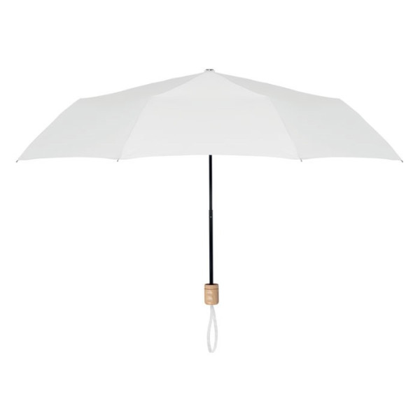 21'' Regenschirm aus 190T RPET Pongee. Stangen und Spitzen aus schwarz überzogenem Metall. Griff aus Holz. 3fach gefaltet. Passende Schirmhülle. Manuelle Öffnung und Schließung.