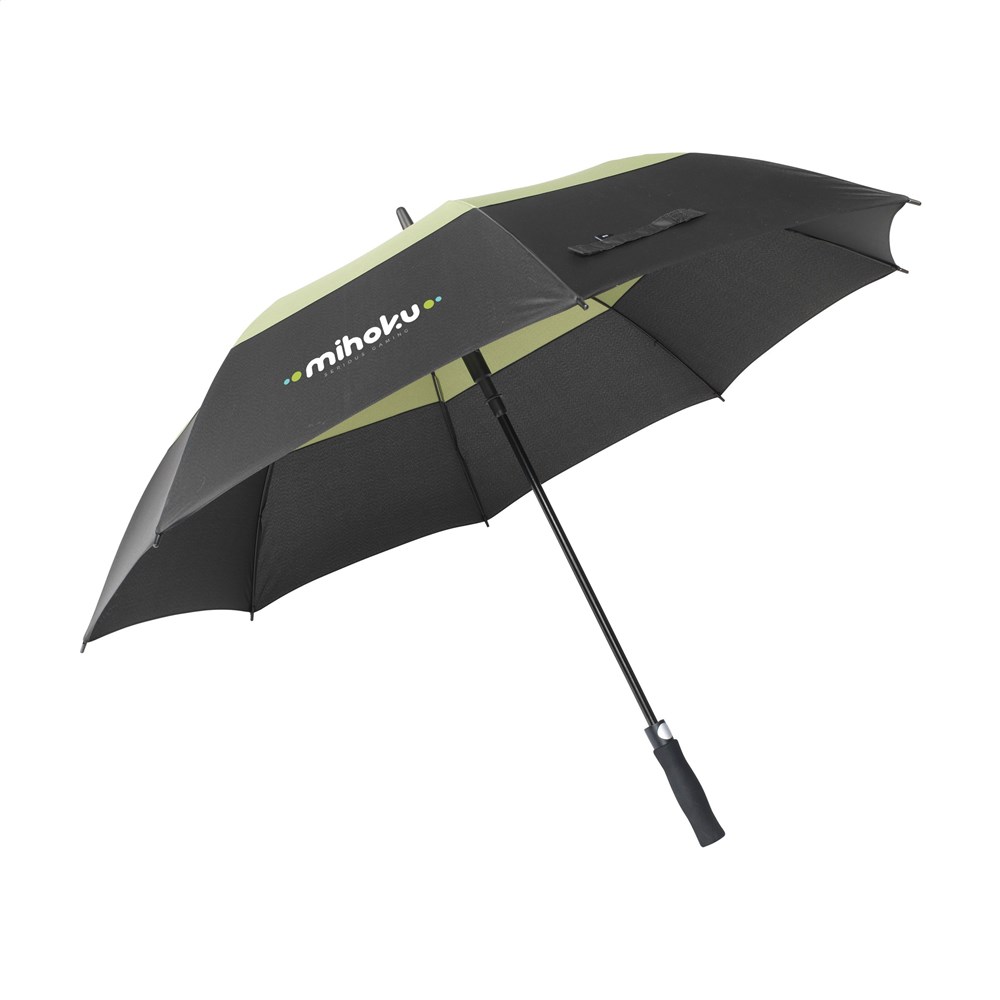 Regenschirm mit einer 2-farbigen Bespannung aus 190T RPET-Polyester. Dieser auffällige Regenschirm hat einen extragroßen Schirmdurchmesser von 120 cm. Mit automatischer Teleskopöffnung, Fiberglasrahmen und -schaft, Griff aus EVA-Weichschaum und Klettverschluss. Dieser Regenschirm wird teilweise aus recycelten PET-Flaschen hergestellt.