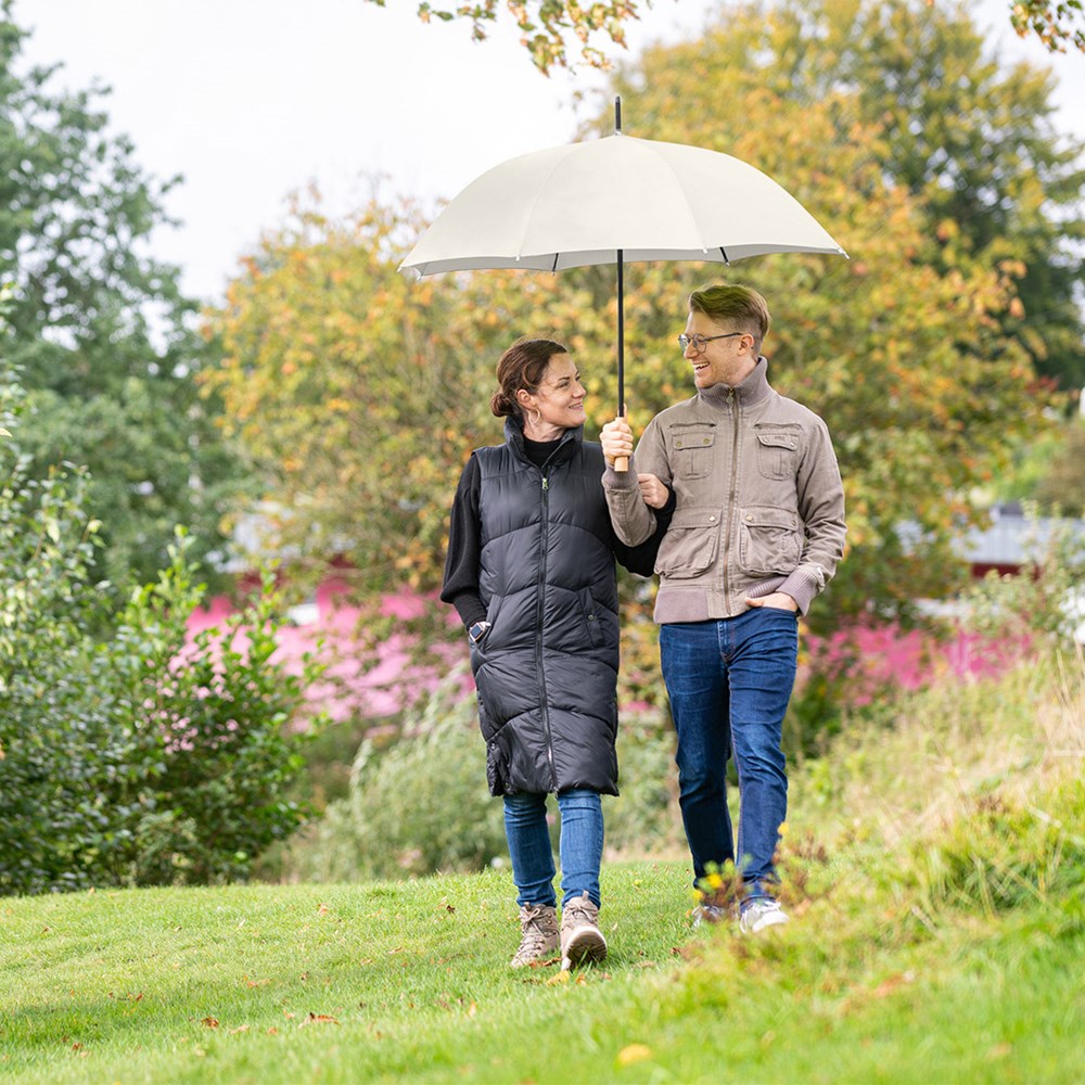 Preislich attraktiver nachhaltiger Gästeschirm mit Bezug aus recycelten Kunststoffen und Echtholzelementen Komfortable Automatik-Funktion zum schnellen Öffnen, hochwertiges Windproof-PLUS-System für eine maximale Gestell-Flexibilität bei stärkeren Windböen, flexible Fiberglasschienen, wassersparend gefärbtes Polyester-Pongee waterSAVE® Bezugsmaterial aus recycelten Kunststoffen, mit waterSAVE®-Label auf dem Schließband, Echtholzspitzen, gerader Echtholzgriff mit Werbeanbringungsmöglichkeit, höherer Korrosionsschutz durch schwarze Galvanisierung des Stahlstocks
