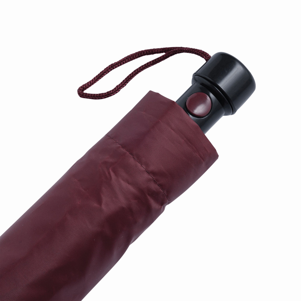 Automatik-Taschenschirm PRIMA, im farblich abgestimmten Futteral: 3-teiliger Metallstock, Metallspeichen und -tips, schwarzer Kunststoffknauf mit farblich abgestimmter Automatik-Auslösetaste und Handschlaufe, Polyester-Bespannung und Schließband mit Klettverschluss