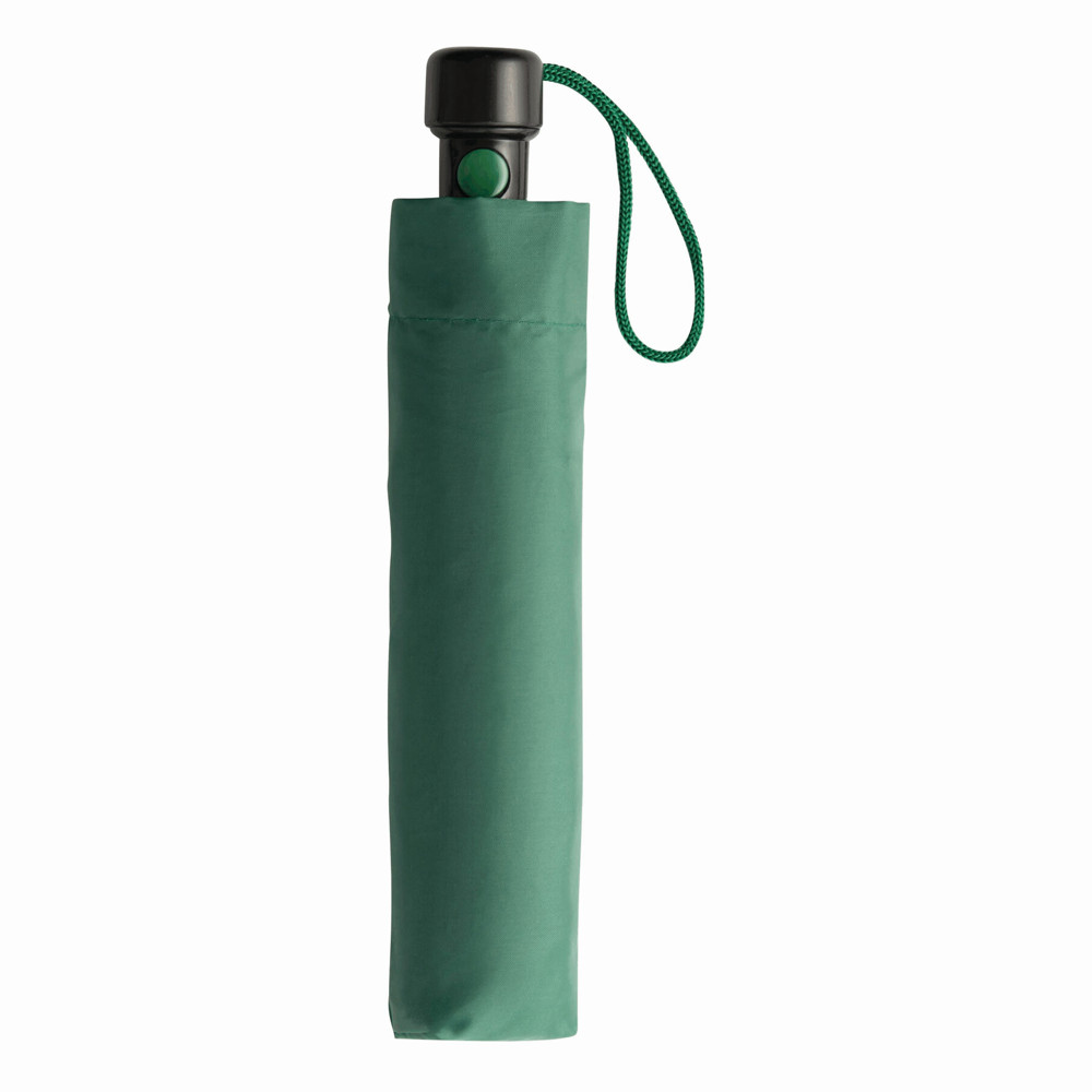 Automatik-Taschenschirm PRIMA, im farblich abgestimmten Futteral: 3-teiliger Metallstock, Metallspeichen und -tips, schwarzer Kunststoffknauf mit farblich abgestimmter Automatik-Auslösetaste und Handschlaufe, Polyester-Bespannung und Schließband mit Klettverschluss