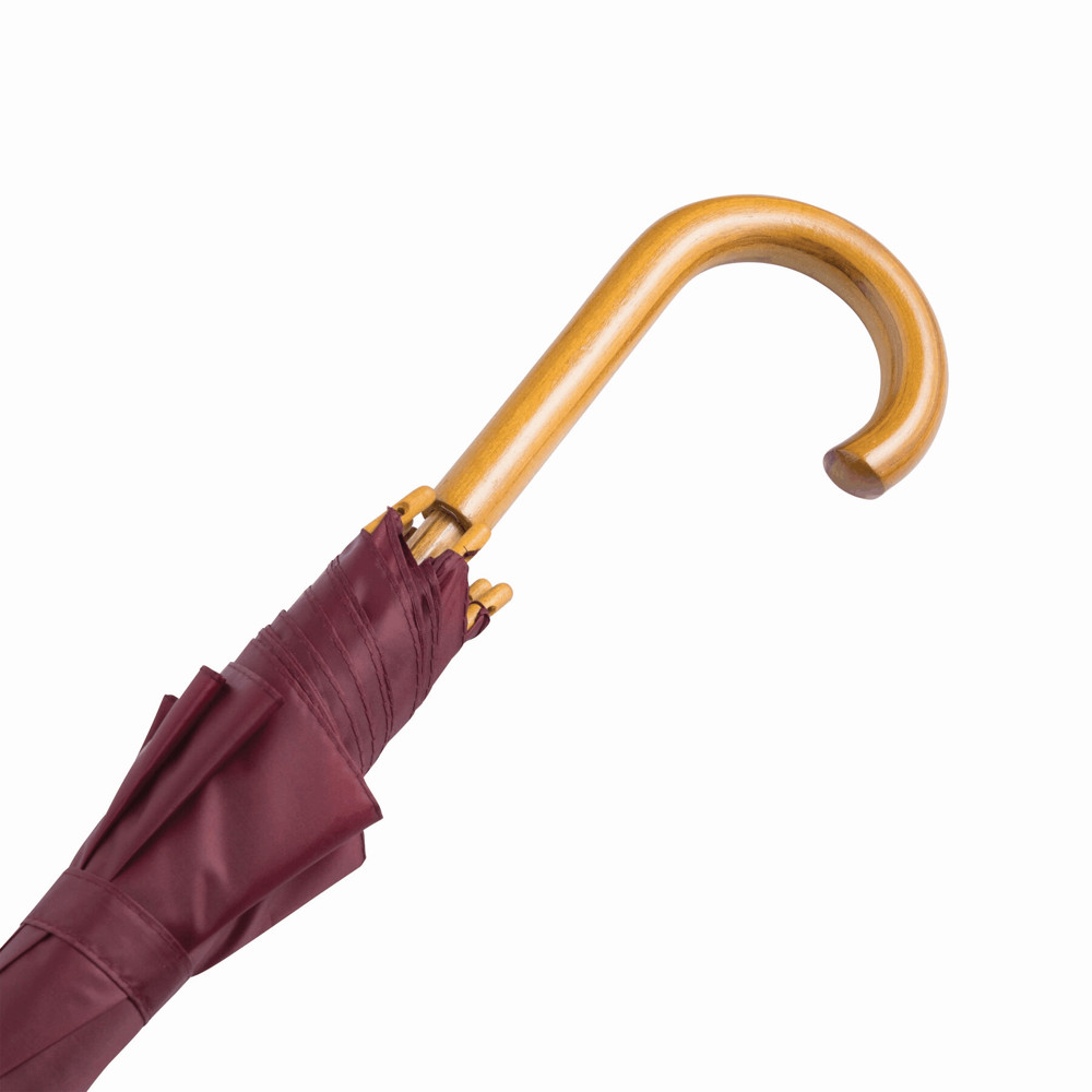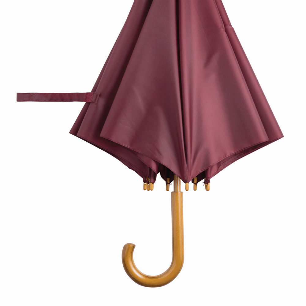 Automatik-Holzstockschirm TANGO: Metallspeichen, Holztips und -Rundhakengriff, Polyester-Bespannung, Schließband mit Klettverschluss