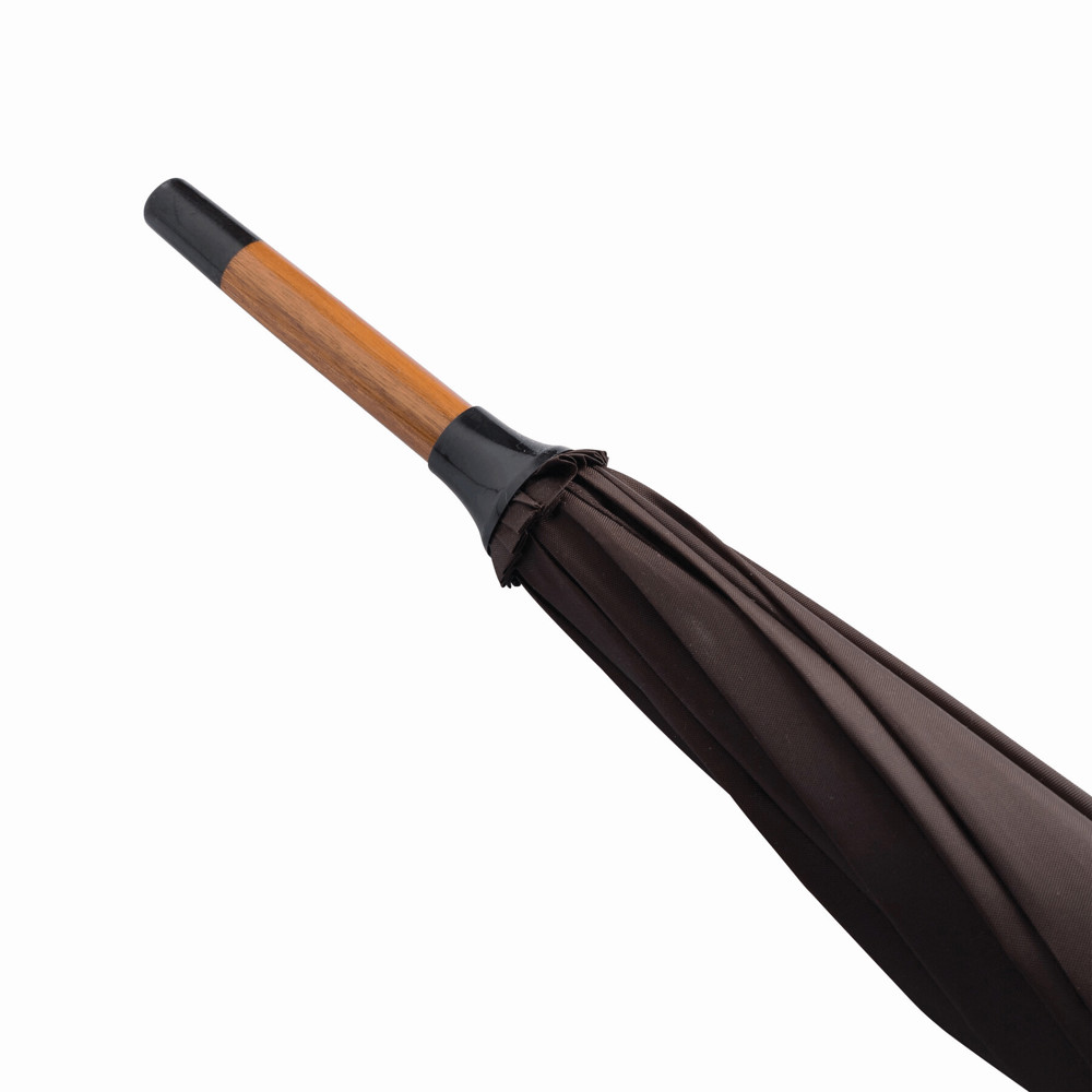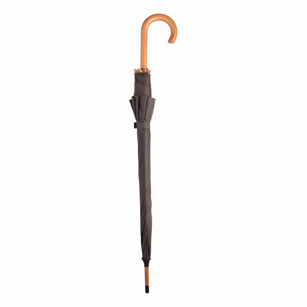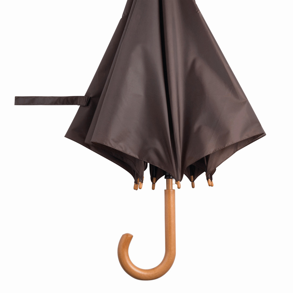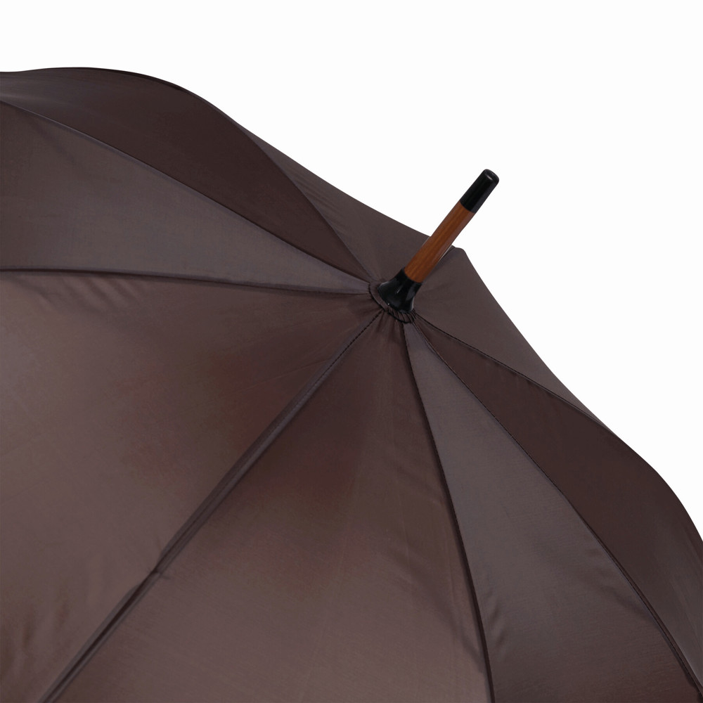 Automatik-Holzstockschirm TANGO: Metallspeichen, Holztips und -Rundhakengriff, Polyester-Bespannung, Schließband mit Klettverschluss