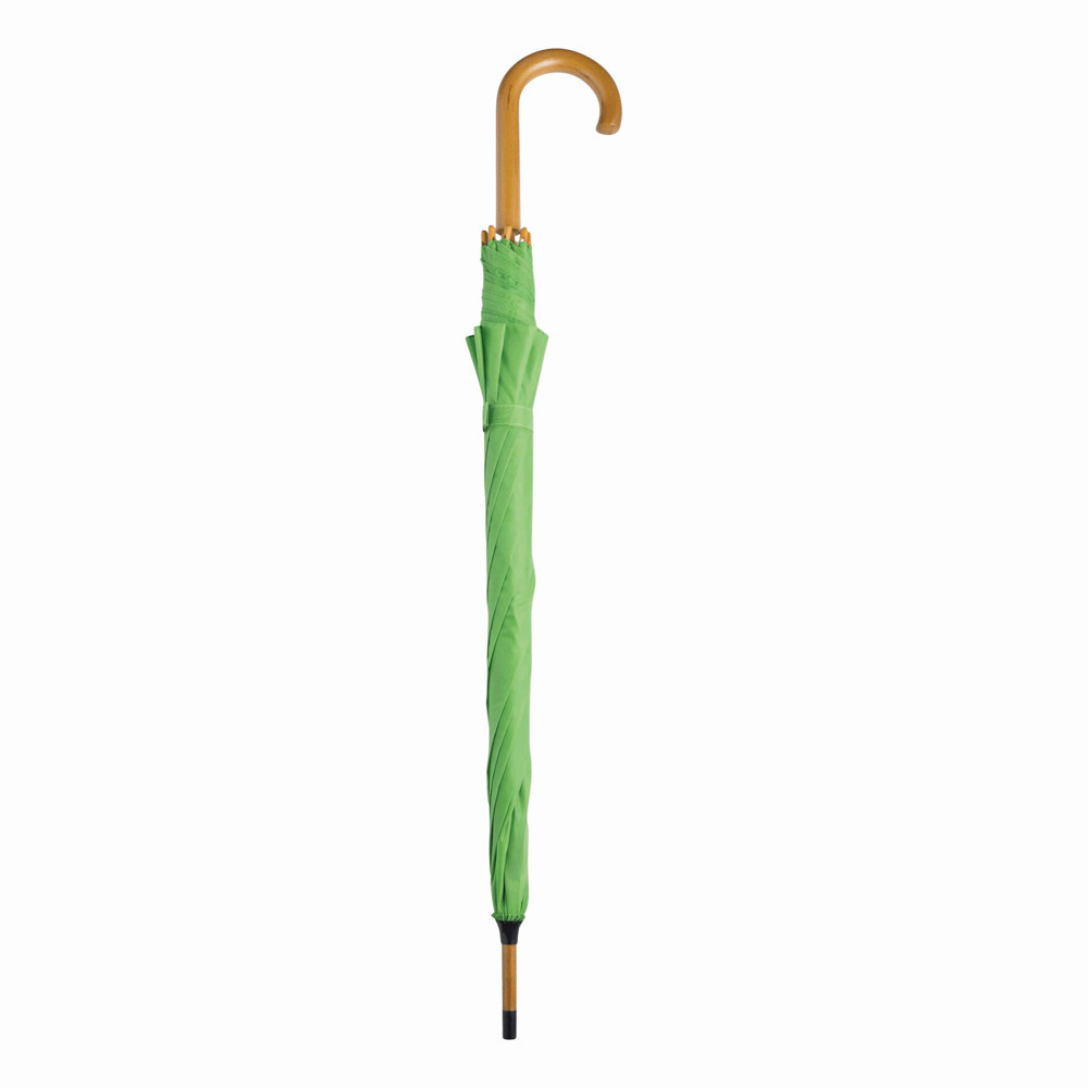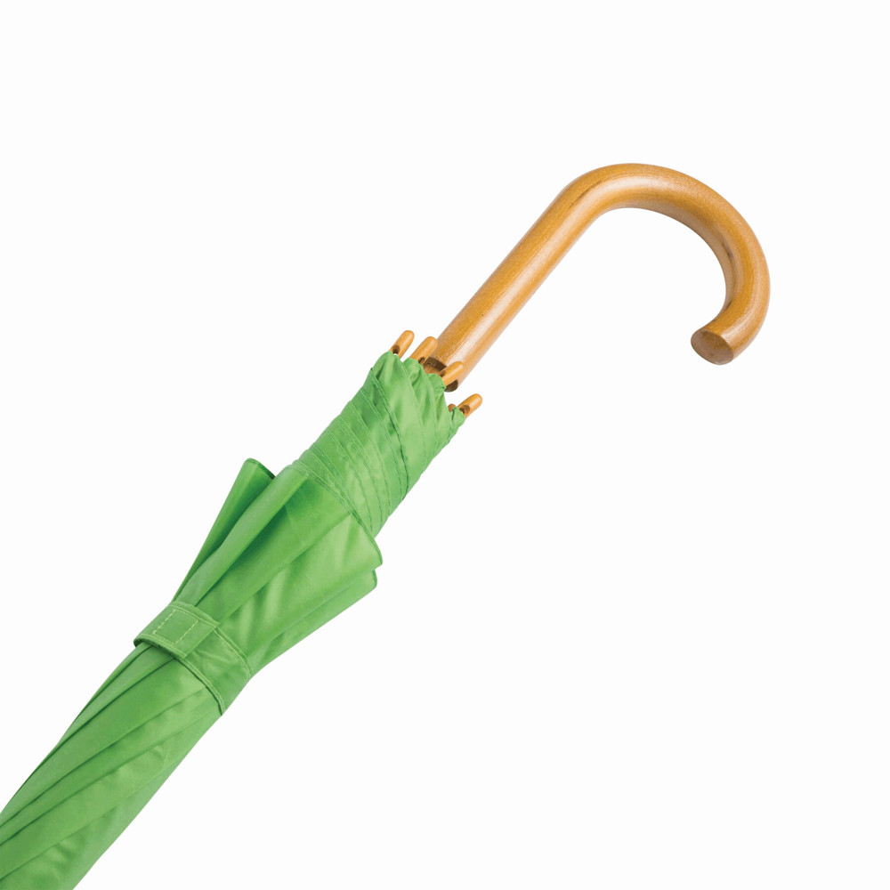 Automatik-Holzstockschirm TANGO: Metallspeichen, Holztips und -Rundhakengriff, Polyester-Bespannung, Schließband mit Klettverschluss