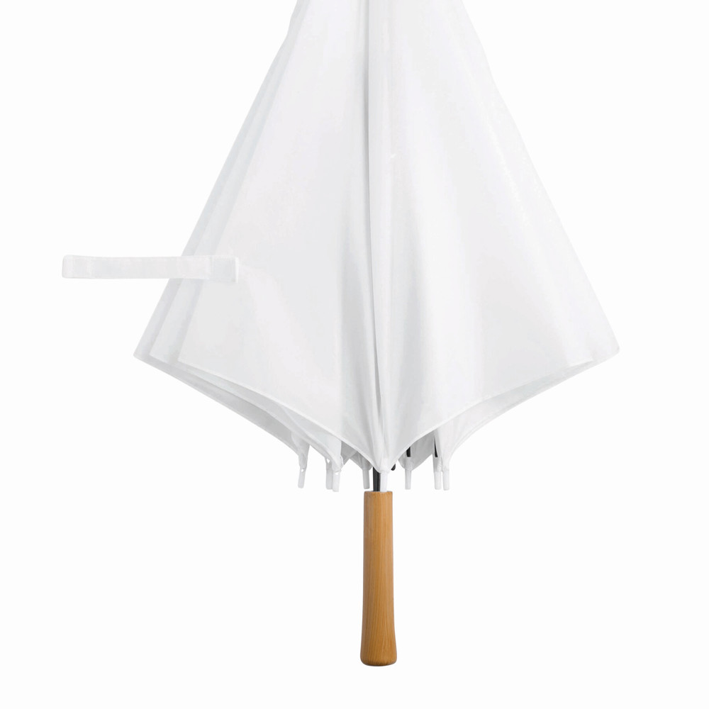 Automatik-Stockschirm LIMBO: Metallstock und -speichen, farblich abgestimmte Kunststofftips, Griff in Holz-Optik, Polyester-Bespannung, Schließband mit Klettverschluss