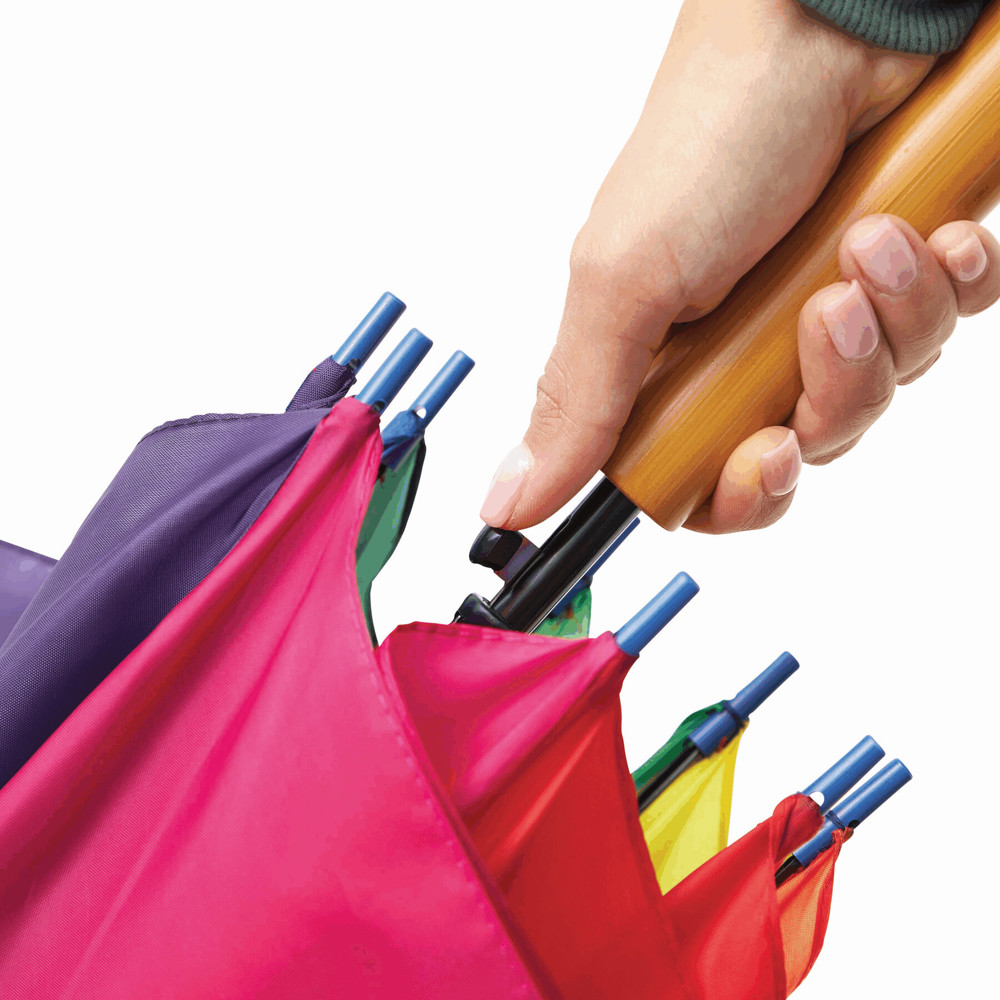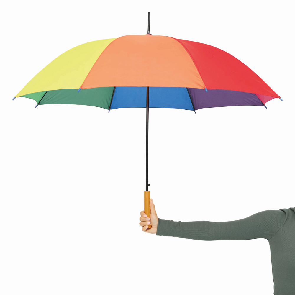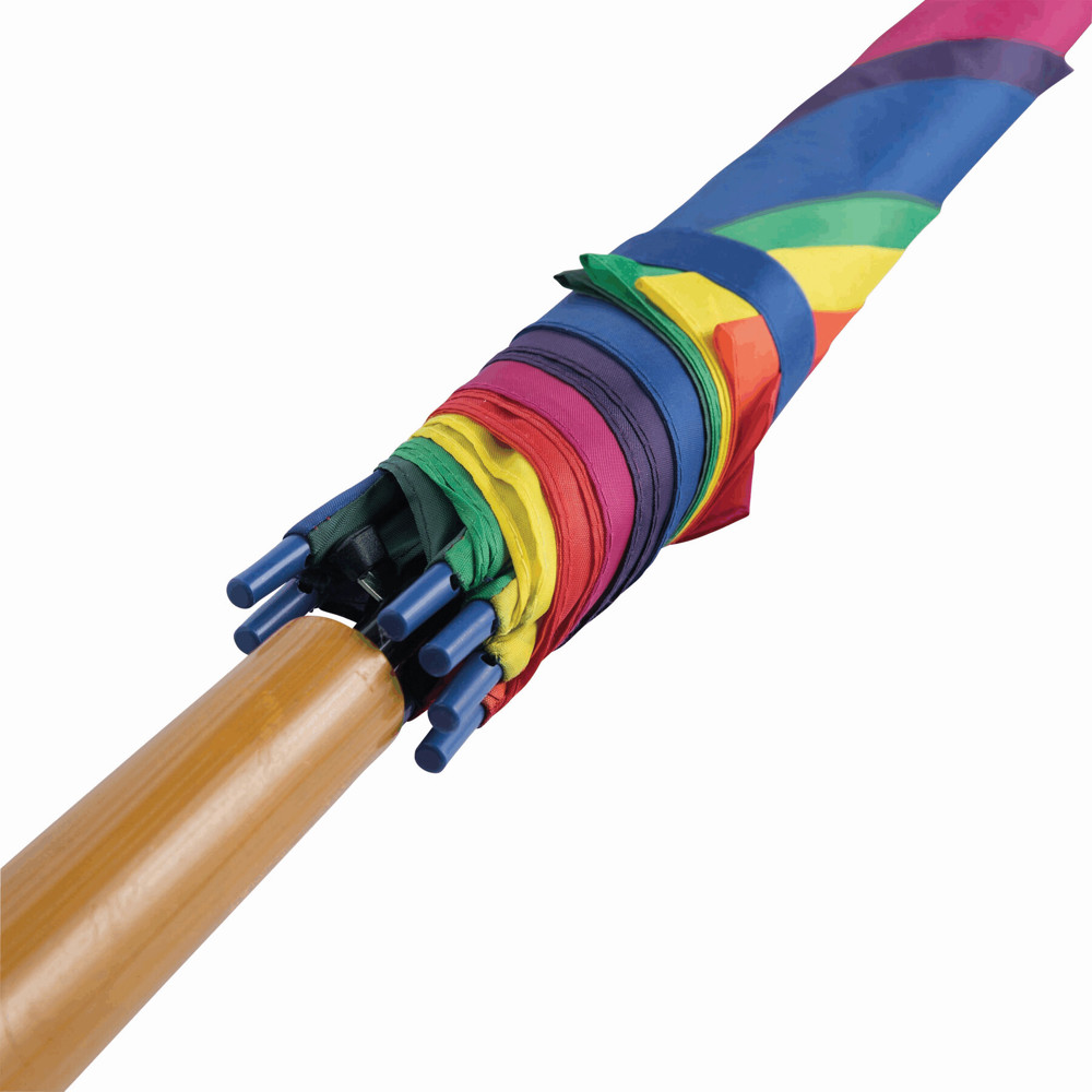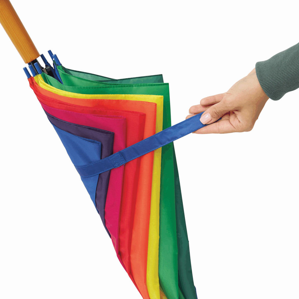 Automatik-Stockschirm LIMBO: Metallstock und -speichen, farblich abgestimmte Kunststofftips, Griff in Holz-Optik, Polyester-Bespannung, Schließband mit Klettverschluss