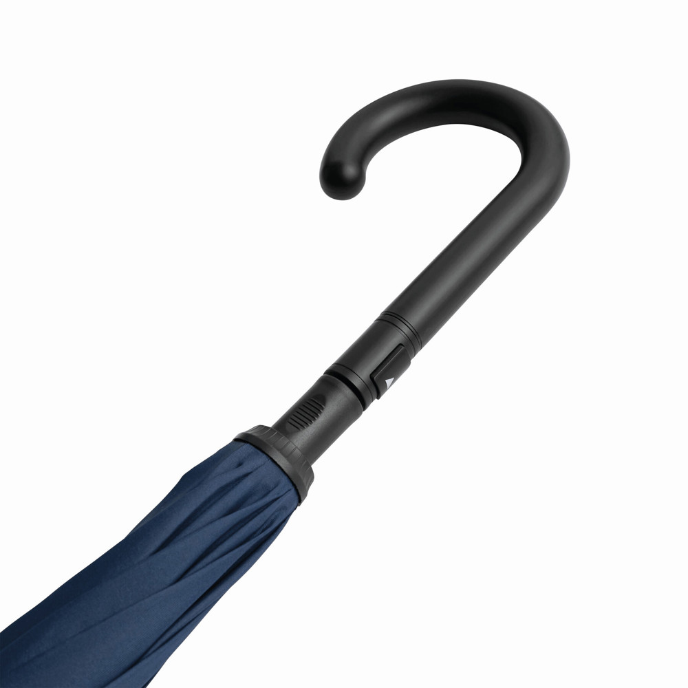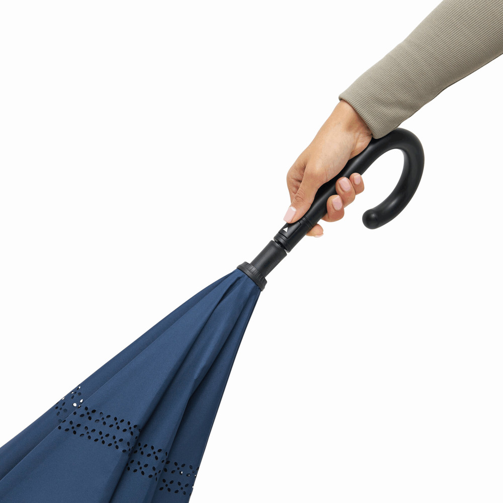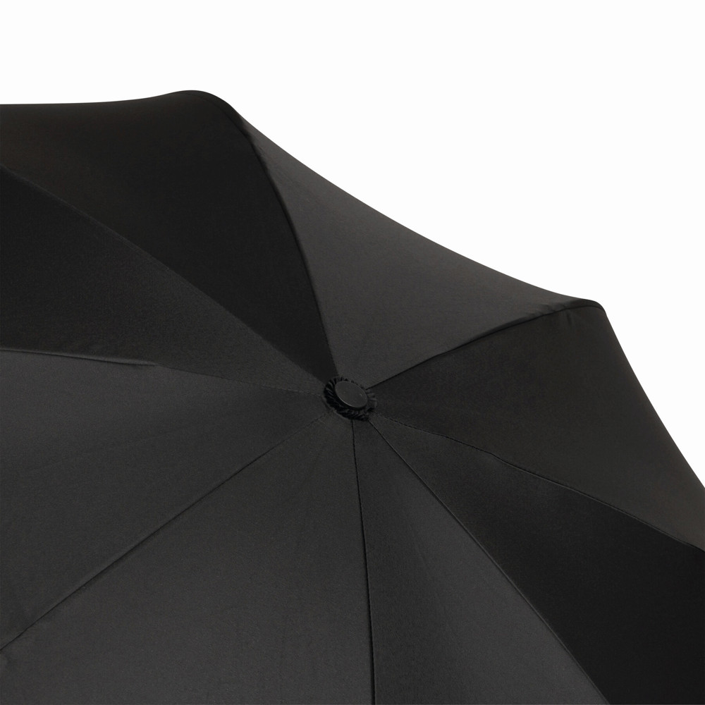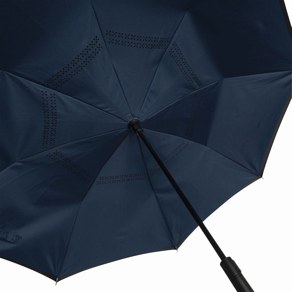 Automatik-Stockschirm OPPOSITE: mit umgekehrtem Öffnungs- und automatischem Schließmechanismus, Doppel-Bezug mit Ventilationsmuster zur Vermeidung von Luftstau, flexibles Gestänge durch Fiberglasspeichen, Metallstock, mit Metalltips, Kunststoffrundhakengriff, Polyester-Pongee-Bespannung, Schließband mit Klettverschluss