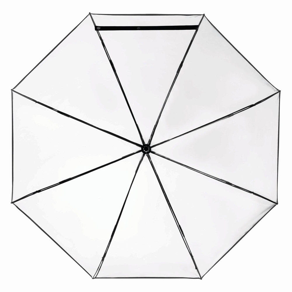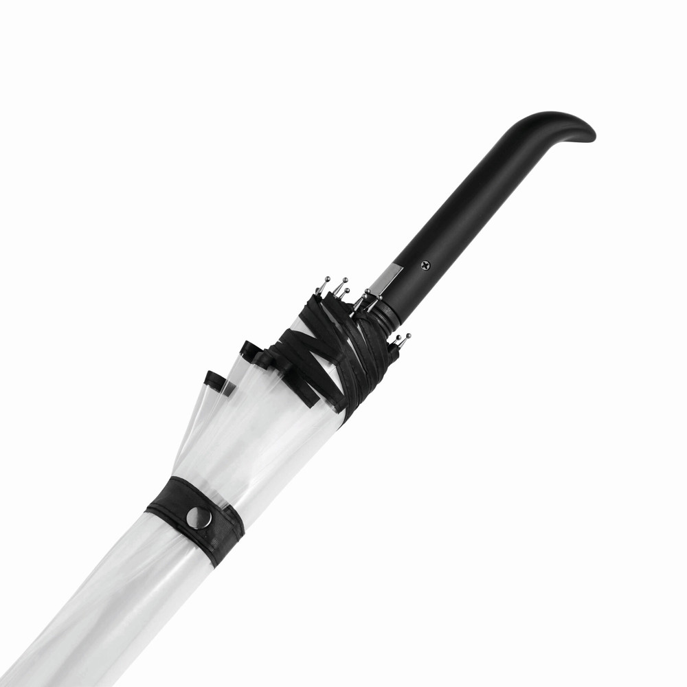 Automatischer Windproof-Stockschirm VIP: Metallstock, farbige Fiberglasspeichen mit Metalltips, Kunststoffspitze, Kunststoffgriff mit integrierter Auslösetaste, transparente POE-Bespannung mit farbiger Paspelierung, Schließband mit Druckknopf