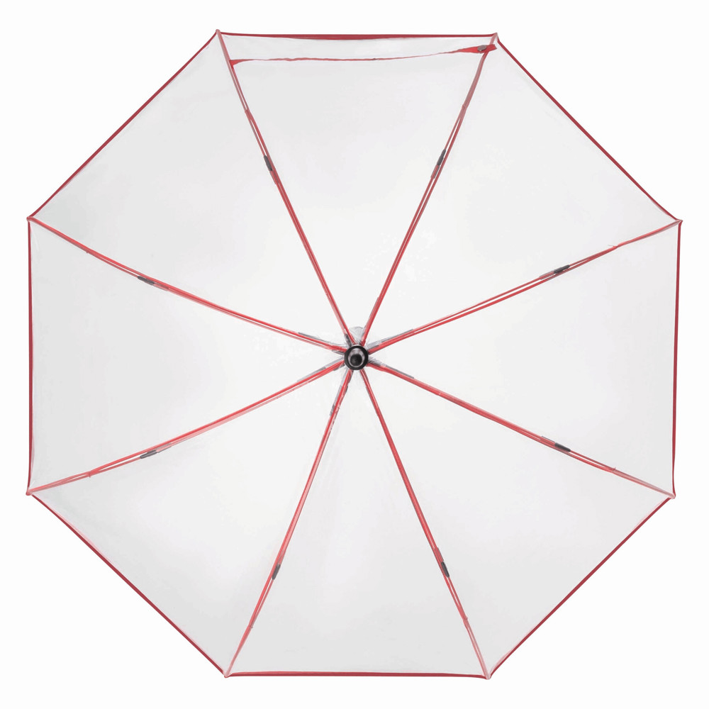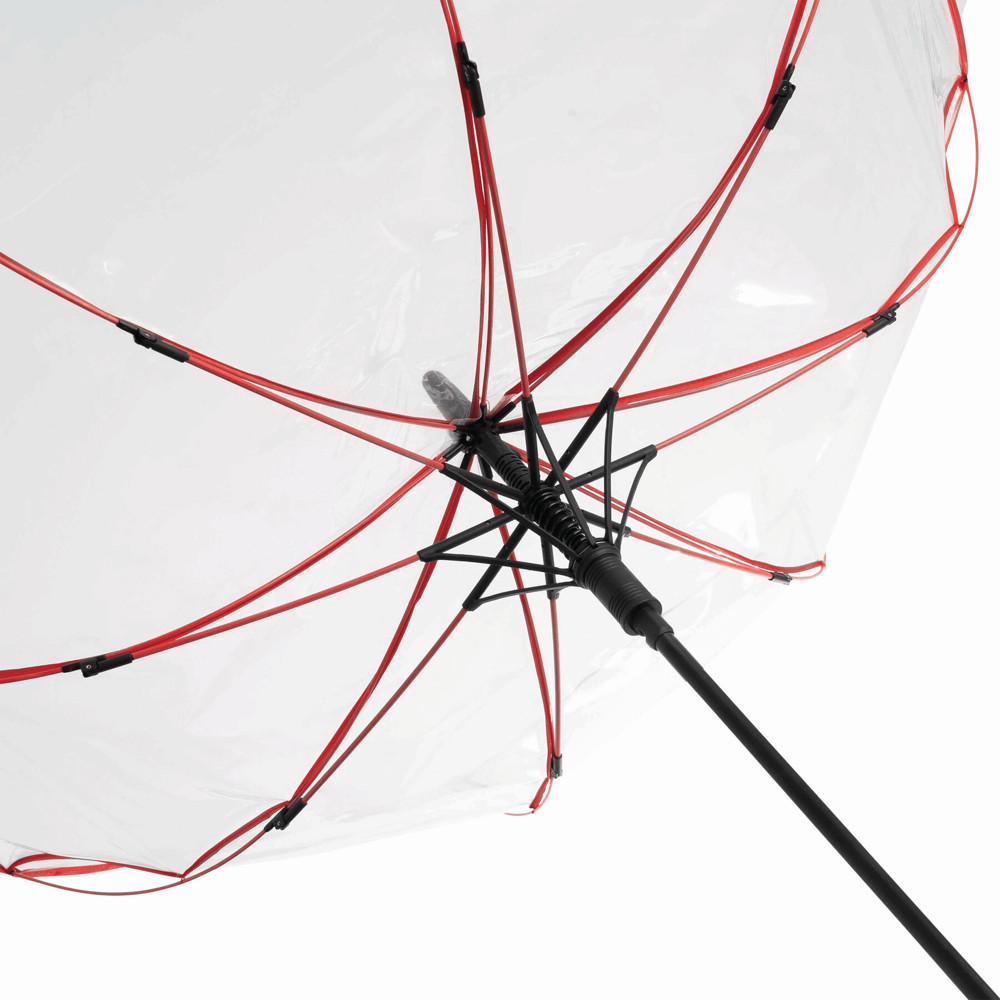 Automatischer Windproof-Stockschirm VIP: Metallstock, farbige Fiberglasspeichen mit Metalltips, Kunststoffspitze, Kunststoffgriff mit integrierter Auslösetaste, transparente POE-Bespannung mit farbiger Paspelierung, Schließband mit Druckknopf