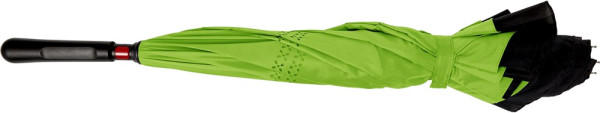 Regenschirm, reversibel, doppelt beschichtet aus Pongee-Seide, mit schwarzem Fiberglasgestell und -stangen, Aluminiumschaft, Kunststoffgriff und Klettverschluss.