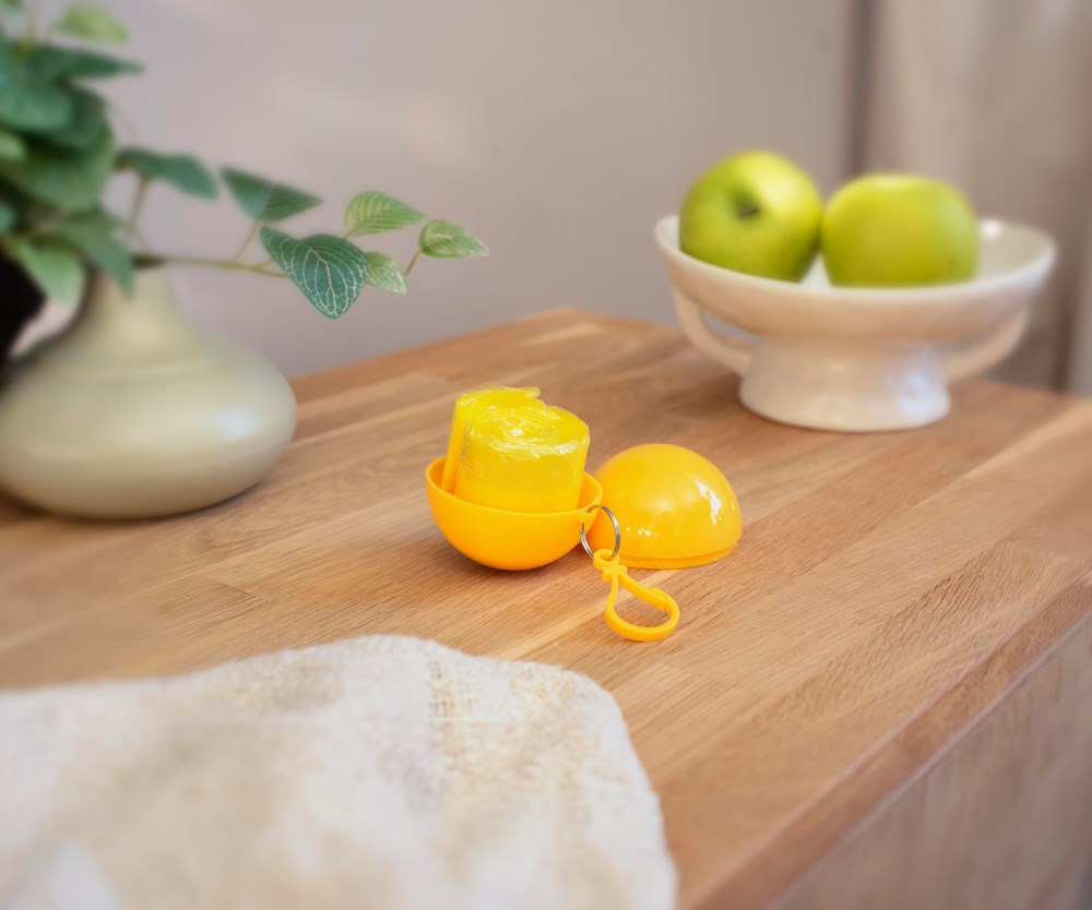 Poncho transparent, verpackt in ABS-Kunststoff-Kugel mit Kunststoff-Karabinerhaken.