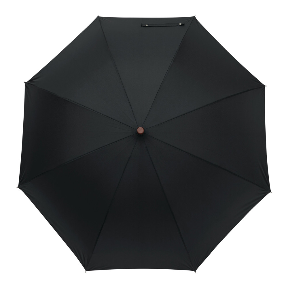 Automatik-Golfschirm EARL: schwarzer Metallstock, Fiberglasspeichen und Metalltips, Holzrundhakengriff und -spitze, Griff mit integrierter Automatik-Auslösetaste, hochwertige Polyester-Pongee-Bespannung, Schließband mit Druckknopf