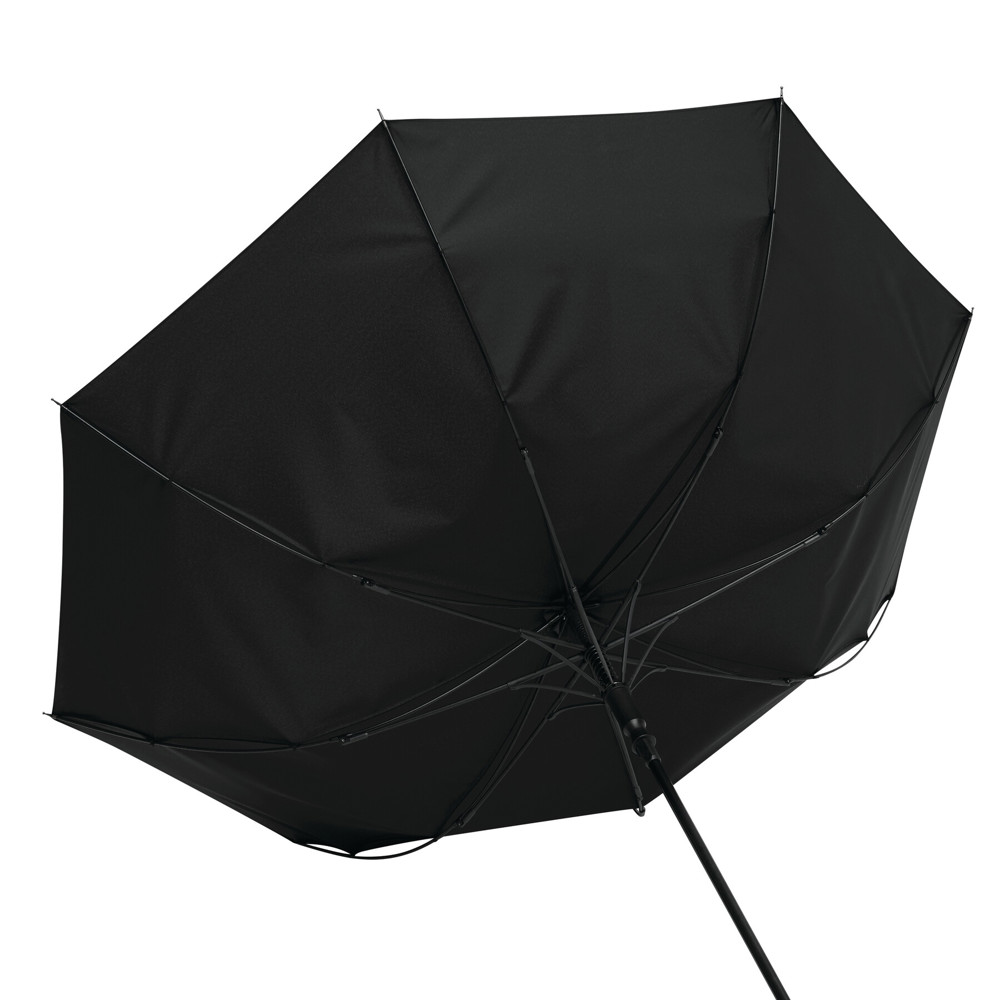 Automatik-Stockschirm POLKA: schwarzer Metallstock, Fiberglasspeichen und Metalltips, gerader Holzgriff mit messingfarbener Automatik-Auslösetaste, Griff mit „CREADO“-Doming, hochwertige Polyester-Pongee-Bespannung und -Hülle, Schließband mit Druckknopf