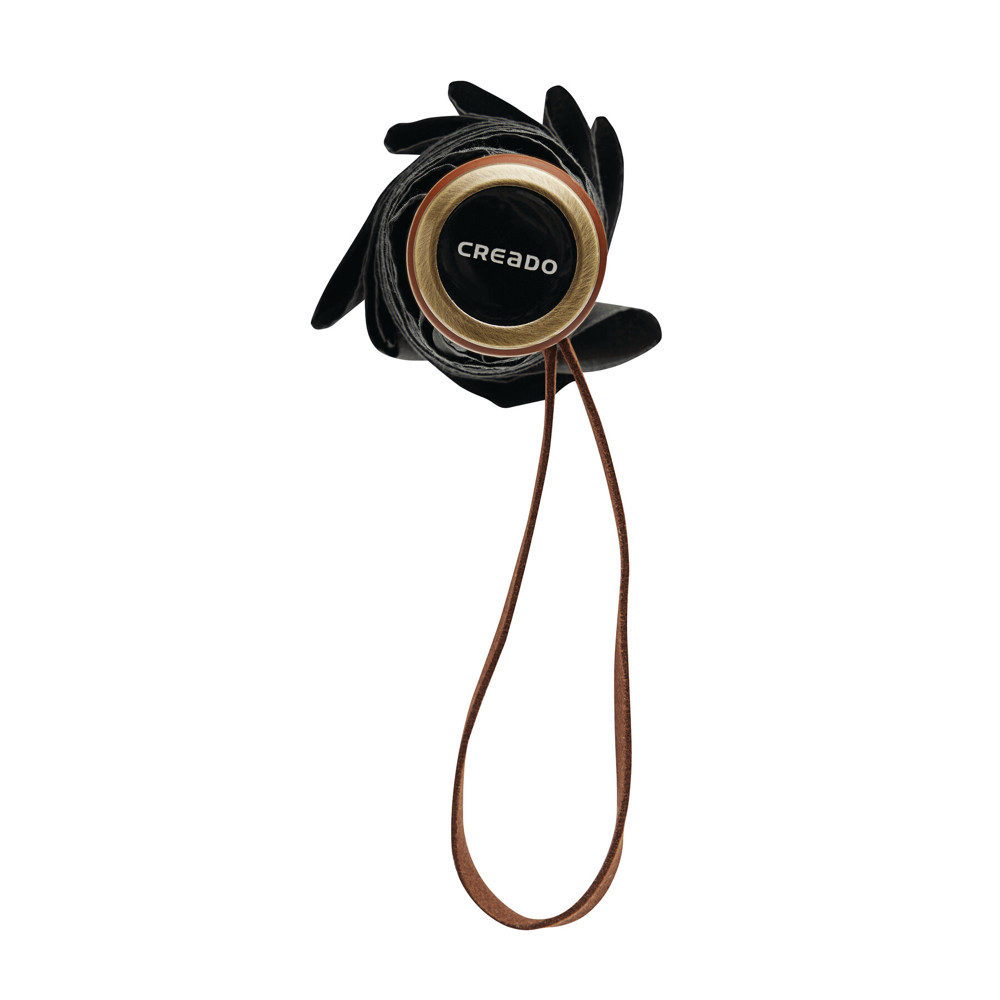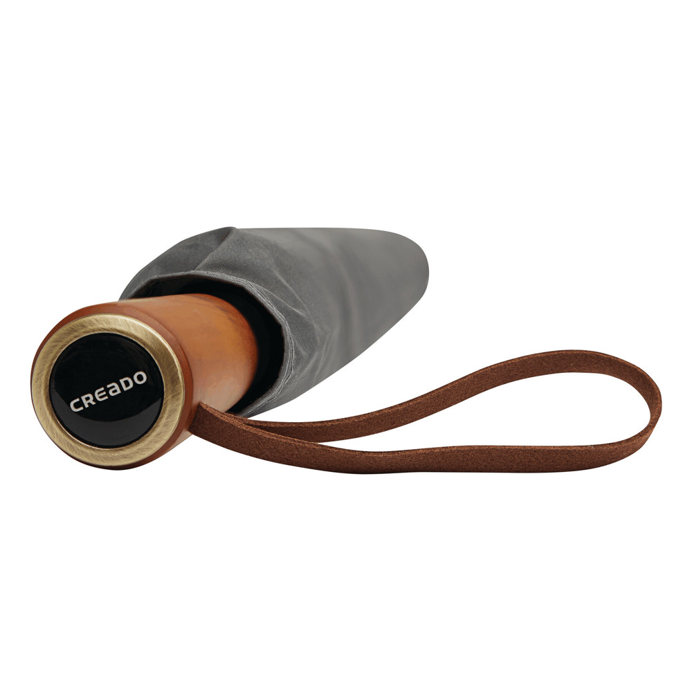 Automatik-Stockschirm POLKA: schwarzer Metallstock, Fiberglasspeichen und Metalltips, gerader Holzgriff mit messingfarbener Automatik-Auslösetaste, Griff mit „CREADO“-Doming, hochwertige Polyester-Pongee-Bespannung und -Hülle, Schließband mit Druckknopf