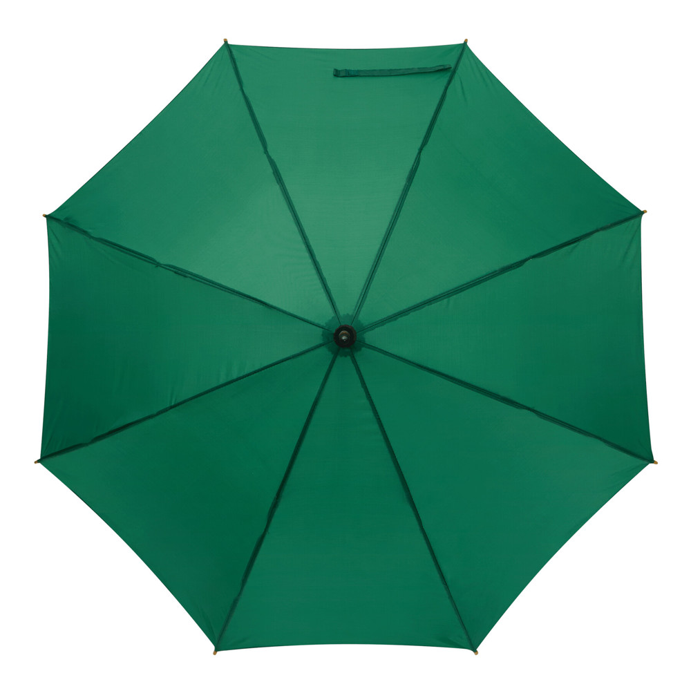 Automatik-Holzstockschirm JAZZ: Fiberglasspeichen, Holztips und -Rundhakengriff, Polyester-Bespannung aus recycelten Kunststoffen / RPET, Schließband mit Klettverschluss