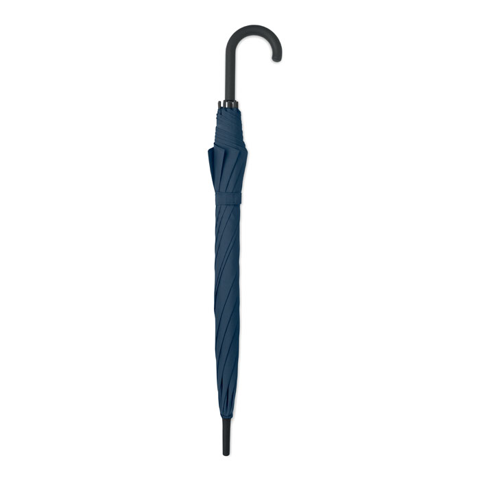 23'' Regenschirm aus 190T Pongee. Stock aus schwarz überzogenem Metall und Stangen aus Fiberglas. Krone und Spitzen aus Kunststoff. Gebogener Griff aus gummiertem PP. Automatische Öffnung, manuelle Schließung.