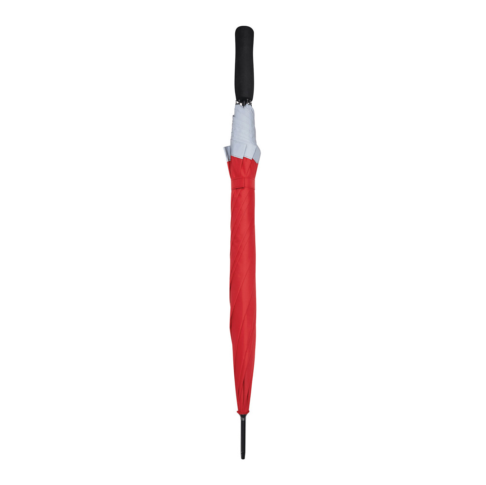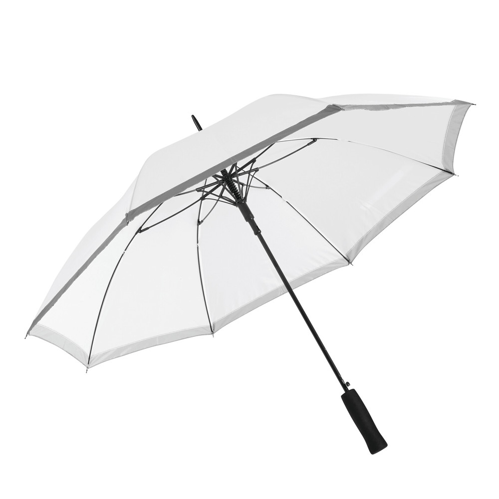 Automatischer Stockschirm CALIMA: Metallstock, Fiberglasspeichen, Metalltips, EVA-Griff, Polyester-Pongee-Bespannung aus recycelten Kunststoffen / rPET, mit silberfarbener, reflektierender Umrandung, Schließband mit Klettverschluss