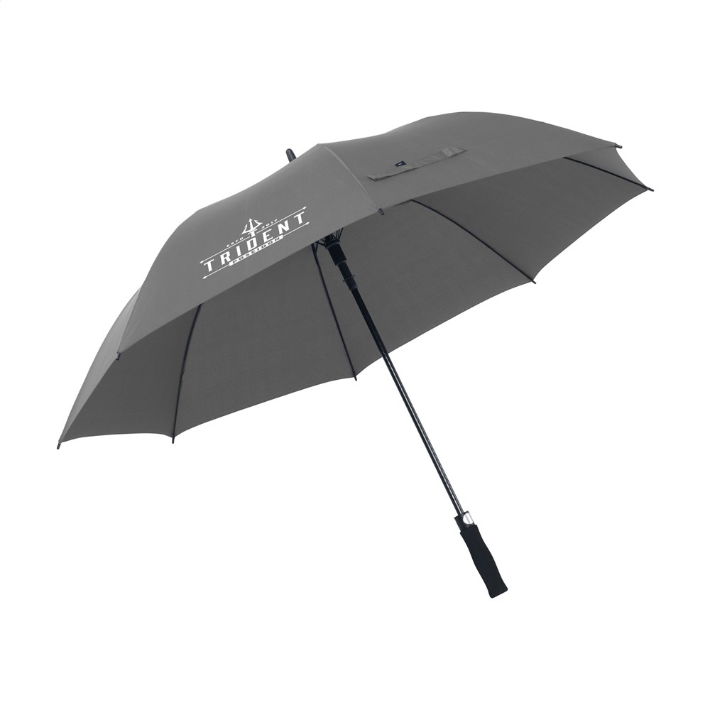 Regenschirm aus 190T RPET-Pongee (hergestellt aus recycelten PET-Flaschen) mit einem extra großen Schirmdurchmesser von 132 cm. Mit automatischer Teleskopöffnung, Fiberglasrahmen und -schaft, Griff aus Weichschaum und Klettverschluss. Wasserabweisend. RCS-zertifiziert. Recyceltes Material insgesamt: 18%.