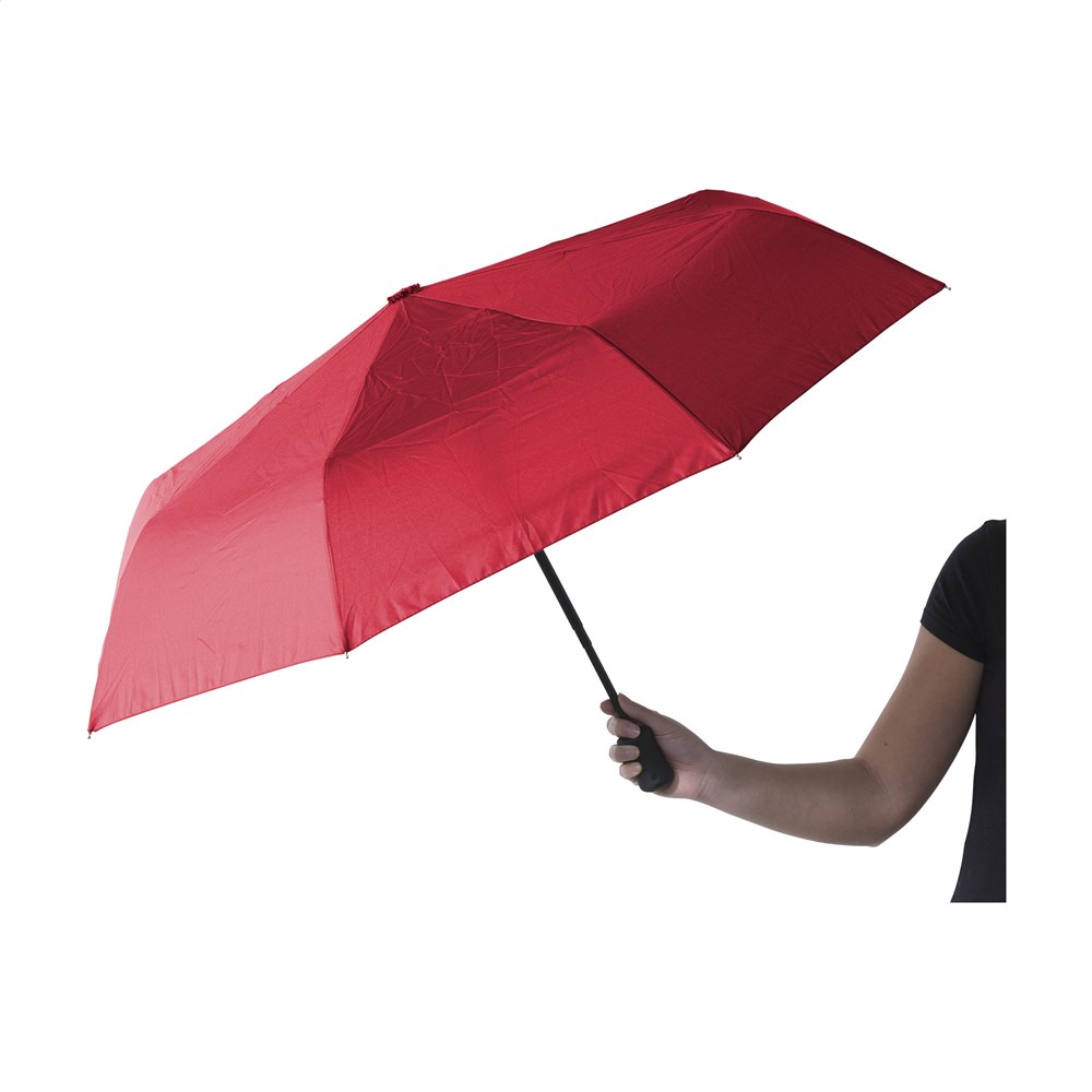 Vollautomatisch ein- und ausklappbarer Regenschirm mit 190T Pongee-bespannung, Schaft und Gestell aus Metall, Gummihandgriff mit Handschlaufe und Klettbandverschluss. In einer Aufbewarungshülle. Maße zusammengeklappt: Ø 5,5 x 28,5 cm.