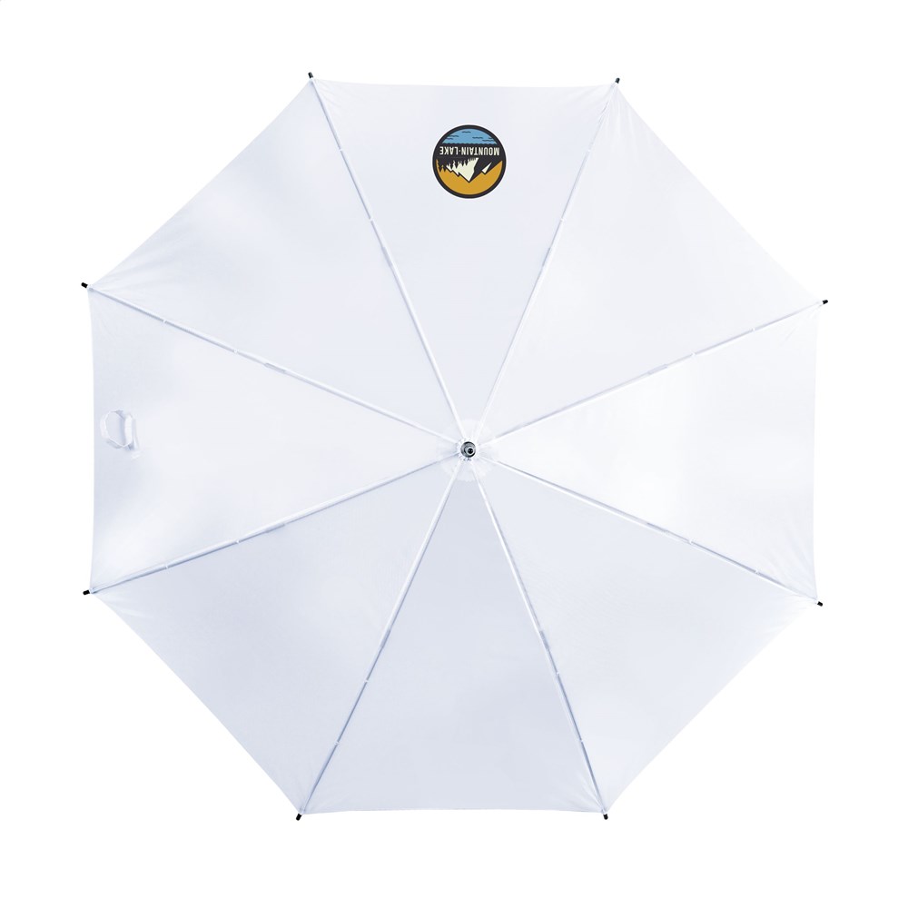 Regenschirm mit automatischer Teleskopöffnung. 190T Polyester-Bespannung, Fiberglasrahmen, Metallschaft, Klettverschluss, gebogenem, klassischem Handgriff, der durch die luxuriöse Gummiummantelung gut in der Hand liegt.