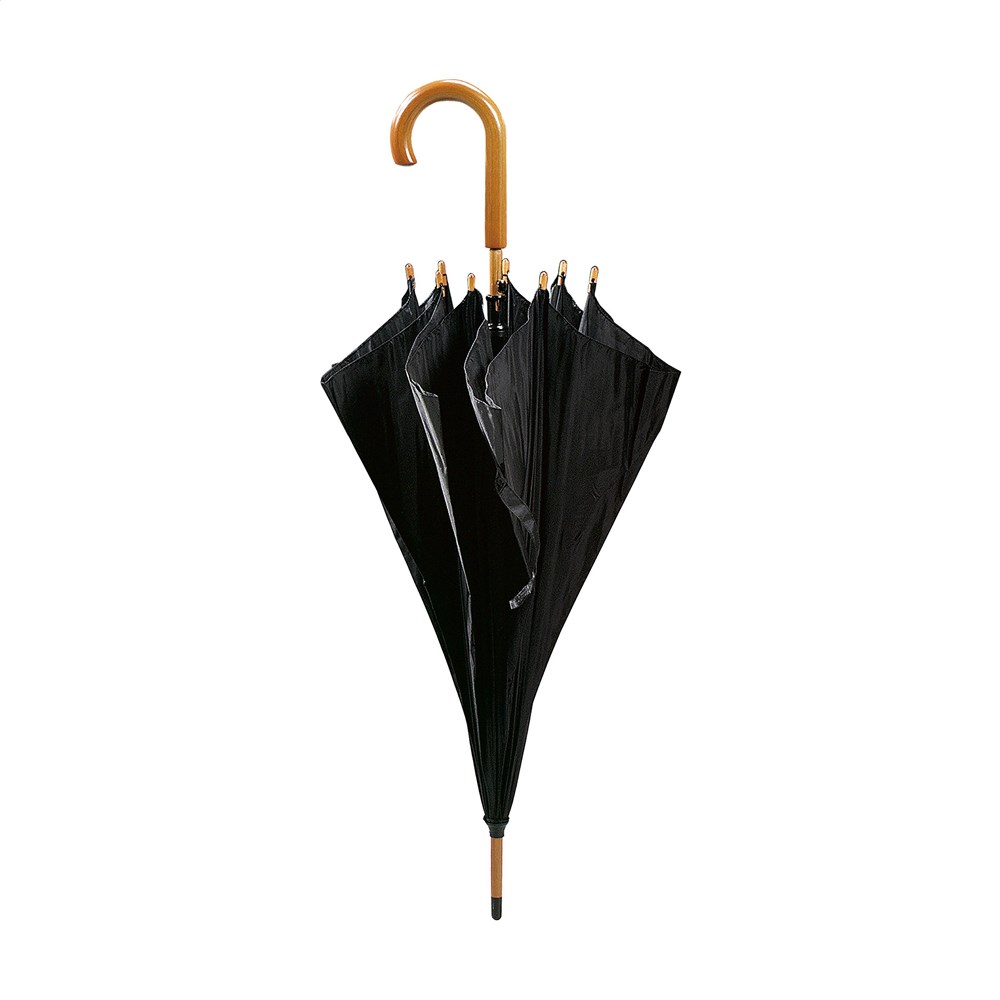 Regenschirm mit automatischer Teleskopöffnung, 190T RPET Pongee-Bespannung, Metallgestell, Holzschaft und -griff sowie einem Klettverschluss. RCS-zertifiziert. Recyceltes Material insgesamt: 15%
