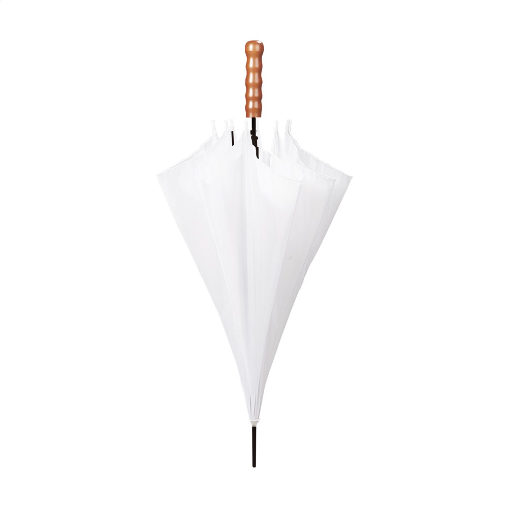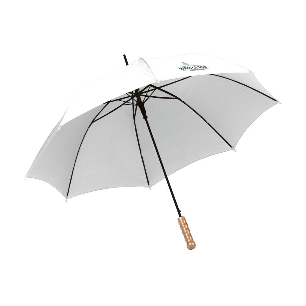 Regenschirm mit automatischer Teleskopöffnung, 190 T Polyesterbespannung, Metallgestell/-schaft, Holzgriff und Klettverschluss.