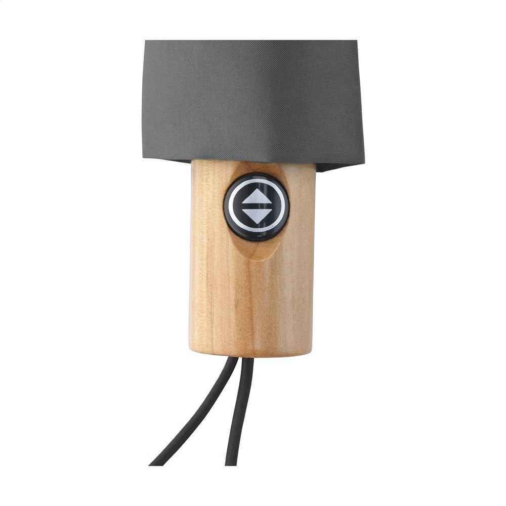 Faltbarer Regenschirm mit automatischem Öffnungs- und Schließmechanismus. Mit einem RPET 190T Pongee-Polyester-Bezug. Dieser Regenschirm ist mit einem Schaft und einem Gestell aus Edelstahl, einem Holzgriff, einer elastischen Handschlaufe und einem Klettverschluss ausgestattet. Lieferung in einer Aufbewarungshülle. Länge zusammengefaltet: 28 cm. Maße zusammengeklappt: Ø 6 x 28,5 cm. RCS-zertifiziert. Recyceltes Material insgesamt: 16%.