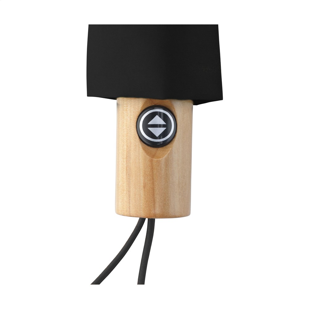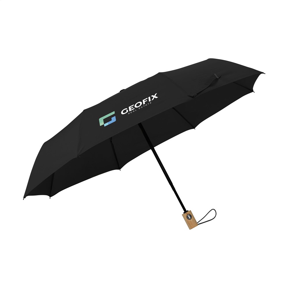 Faltbarer Regenschirm mit automatischem Öffnungs- und Schließmechanismus. Mit einem RPET 190T Pongee-Polyester-Bezug. Dieser Regenschirm ist mit einem Schaft und einem Gestell aus Edelstahl, einem Holzgriff, einer elastischen Handschlaufe und einem Klettverschluss ausgestattet. Lieferung in einer Aufbewarungshülle. Länge zusammengefaltet: 28 cm. Maße zusammengeklappt: Ø 6 x 28,5 cm. RCS-zertifiziert. Recyceltes Material insgesamt: 16%.