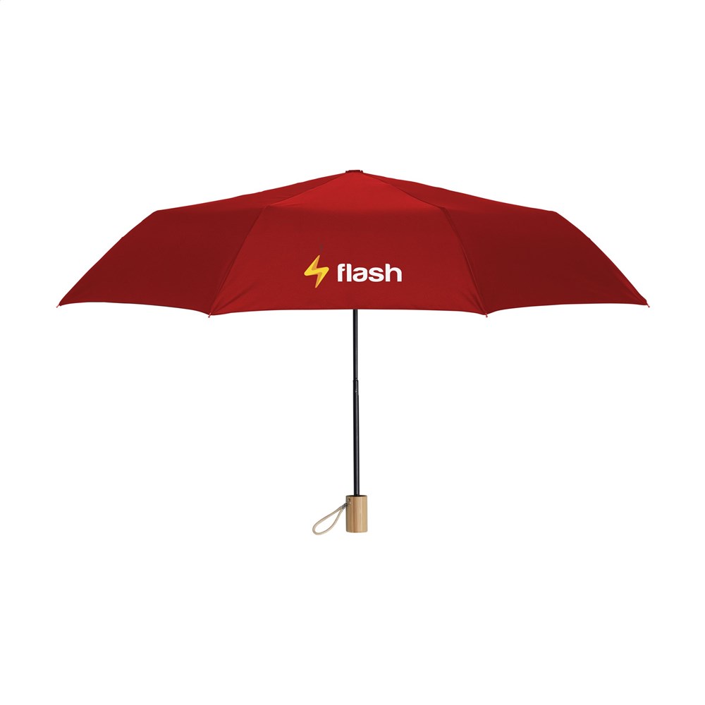 Faltbarer Regenschirm mit 190T RPET Pongee Polyester-Bezug. Mit mit einem Schaft und einem Gestell aus Edelstahl, einem Bambusgriff mit Baumwollschlaufe, Klettverschluss, Aufbewahrungshülle und RPET-Etikett. Manuelle Bedienung. RCS-zertifiziert. Recyceltes Material insgesamt: 18%.