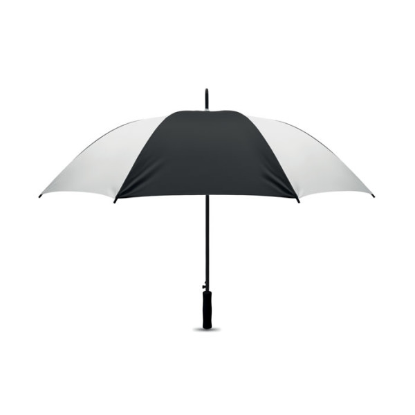 27'' Regenschirm aus 190T Pongee. Stock und Schienen aus schwarz überzogenem Metall, Spitzen aus schwarzem Kunststoff. Schwarzer EVA Griff. Automatische Öffnung, manuelle Schließung.