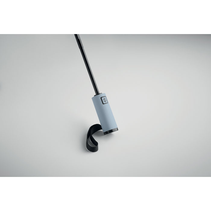 23'' Windproof Regenschirm aus 190T RPET Pongee. 3-fach faltbar. Schwarz beschichtetes Gestell, Stangen aus Fiberglas, gummierter ABS-Griff. Inkl. passende Hülle. Automatische Öffnung und Schließung.