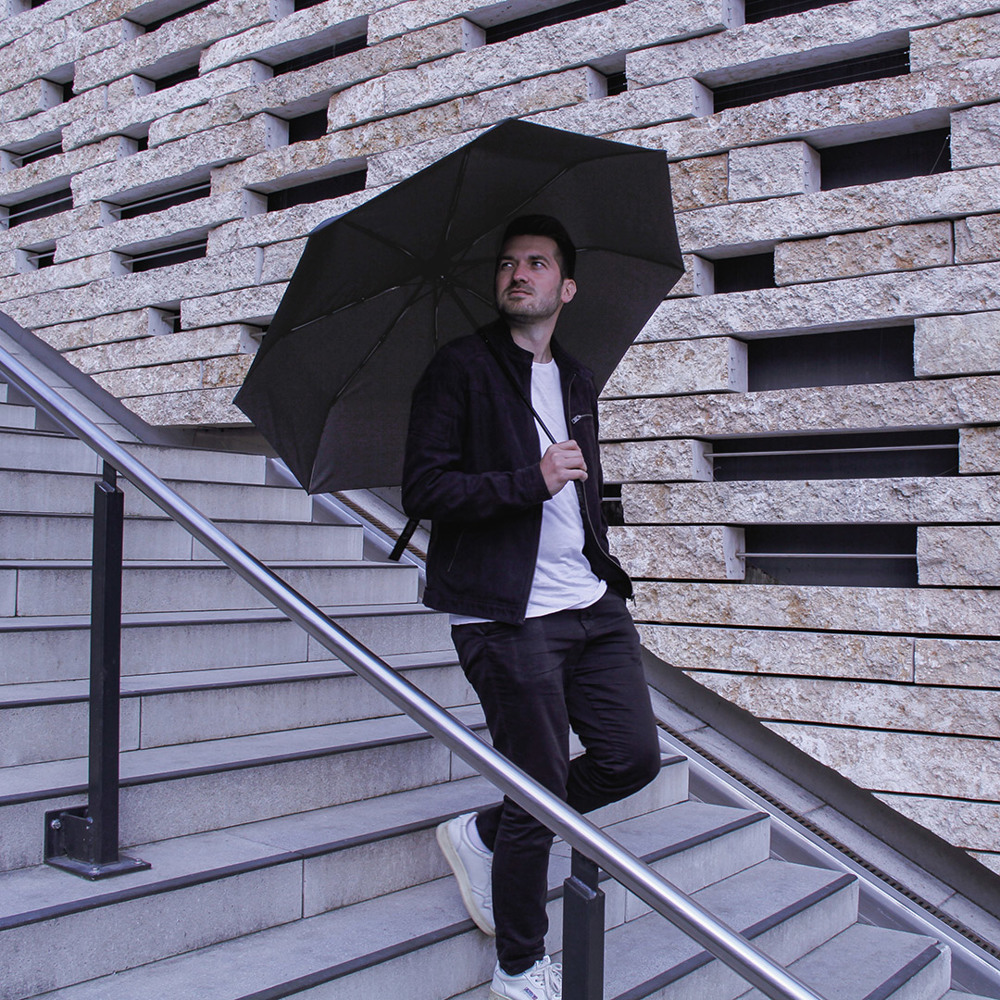 Schicker Doppelautomatik-Taschenschirm in Übergröße in flexiblem EVA-Case Komfortable Doppelautomatik-Funktion zum schnellen Öffnen und Schließen des Schirms, hochwertiges Windproof-PLUS-System für eine maximale Gestell-Flexibilität bei stärkeren Windböen, stabile Fiberglasschienen, wassersparend gefärbtes Polyester-Pongee waterSAVE® Bezugsmaterial aus recycelten Kunststoffenl, mit waterSAVE®-Label auf dem Schließband, matt schwarzer Soft-Feel-Griff, verpackt in flexiblem EVA-Case mit hochwertigem FARE-Zipper