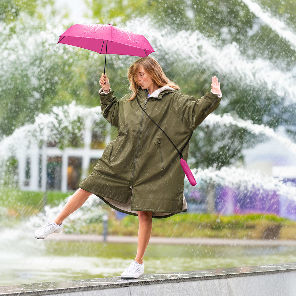 Superleichter Handöffner-Taschenschirm mit abnehmbarem Umhängeband und UV-Schutz Einfache Handhabung durch Sicherheitsschieber, hochwertiges Windproof-PLUS-System für eine maximale Gestell-Flexibilität bei stärkeren Windböen, schwarzer Aluminiumstock, extra leichtes Polyester-Pongee Bezugsmaterial aus recycelten Kunststoffen und mit Lichtschutzfaktor UPF 50+, Kunststoffgriff, Kappe und Lanyard-Klickverschluss aus recyceltem ABS (rABS), Griff mit Werbeanbringungsmöglichkeit, Befestigung des Umhängebandes per Klickverschluss am Futteral oder am Schirm möglich, einfaches Zusammenrollen des Schirms durch breites Schließband