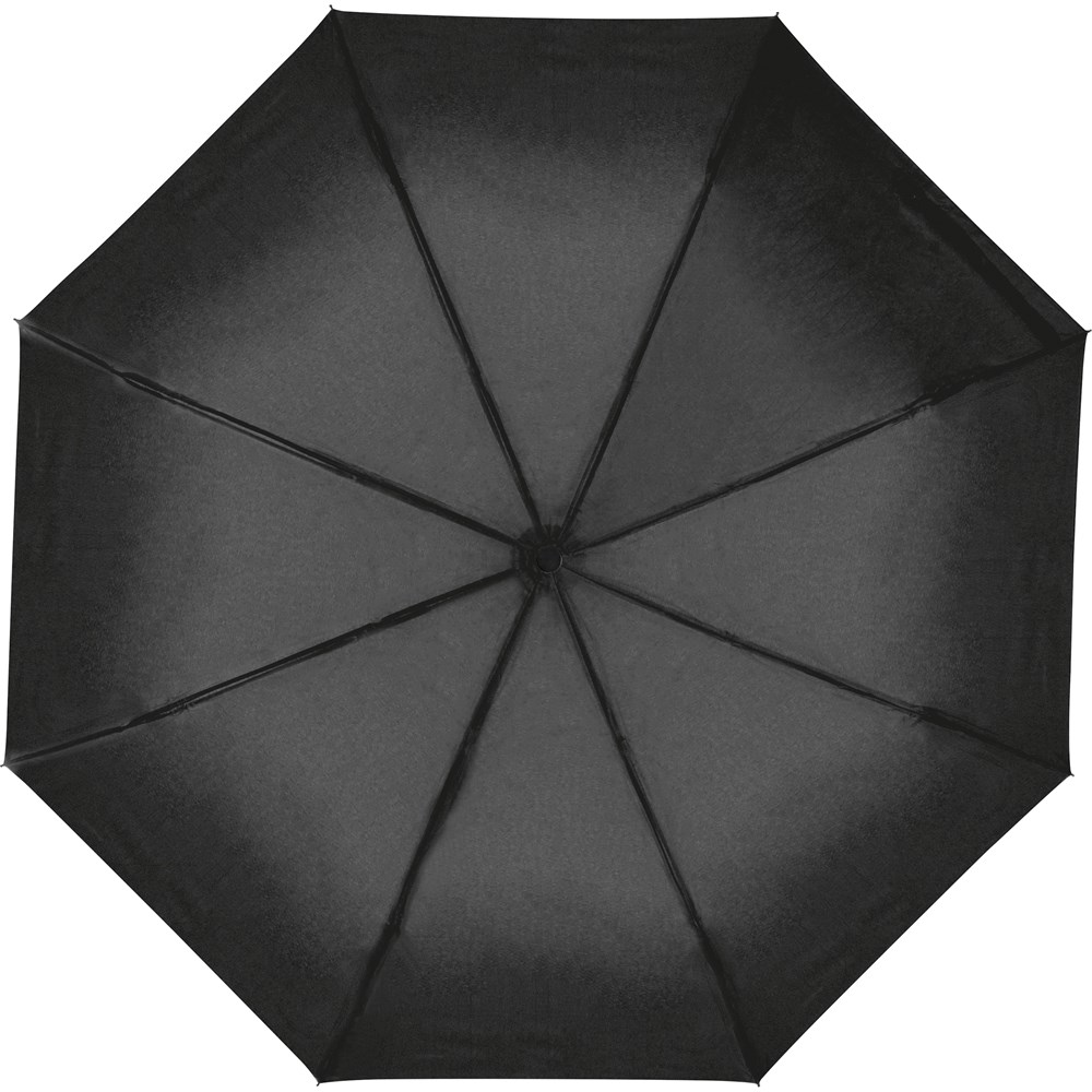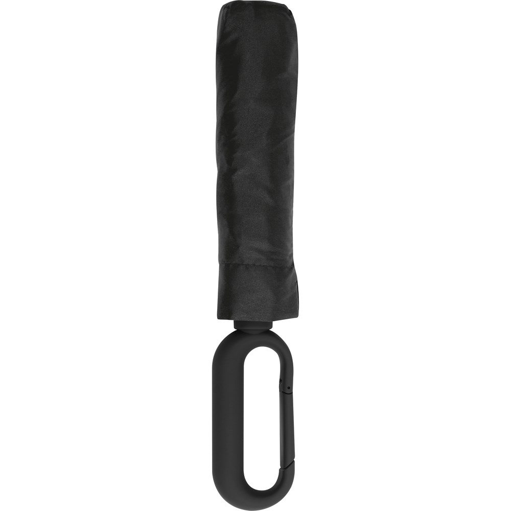 Eleganter Taschenschirm mit 190T-Pongeebespannung und gummiertem Karabinergriff. Ihre Werbung drucken wir auf ein Segment.