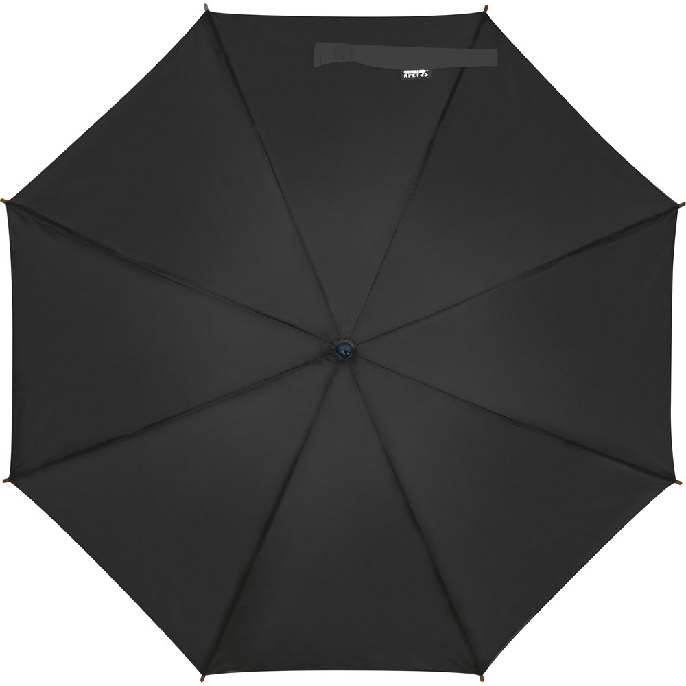 Hochwertiger Automatikregenschirm mit Fiberglasgestänge, Bespannung aus recyceltem PET und gebogenem Holzgriff. Ihre Werbung wird auf ein Segment gedruckt.