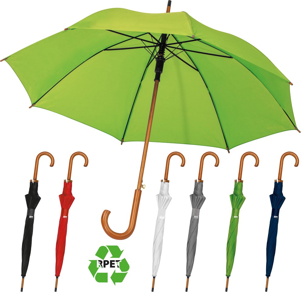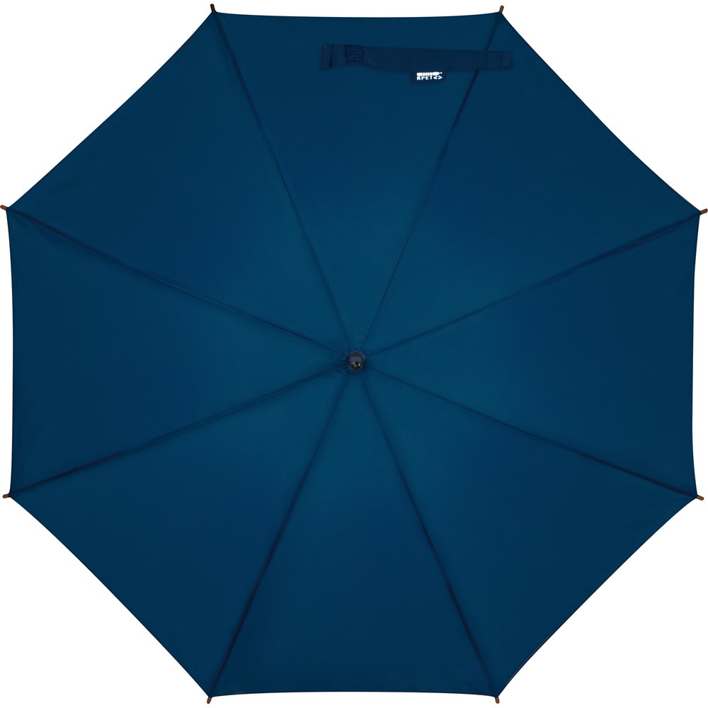 Hochwertiger Automatikregenschirm mit Fiberglasgestänge, Bespannung aus recyceltem PET und gebogenem Holzgriff. Ihre Werbung wird auf ein Segment gedruckt.