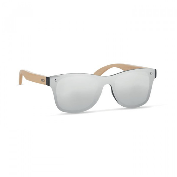 Sonnenbrille mit Bügeln aus Bambus. Komplett verspiegelte Gläser. UV400-Schutz. Da Bambus ein natürliches Material ist, kann der Farbton pro Artikel variieren.