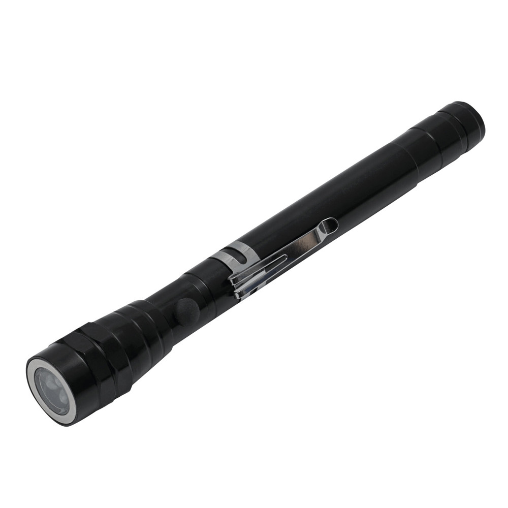 LED-Taschenlampe REFLECT: 3 lichtstarke weiße LED, gummierter An- und Ausschalter, mit bis auf ca. 55 cm ausziehbares Teleskopsystem, schwenkbarer Lampenkopf, Magnetring, praktischer Befestigungsclip, Gehäuse aus Aluminium, batteriebetrieben (4x LR44 Knopfzellen enthalten), in Box