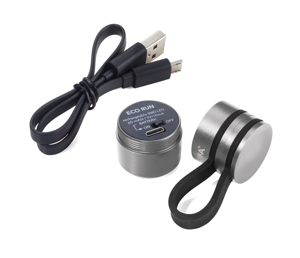 Taschenlampe, Sport- und Sicherheitslicht, inkl. Ladekabel, mit starkem Magnet zur Befestigung, weißes LED-Licht, 3 Leuchtfunktionen: 2 Lichtstärken + Blinklicht, umweltschonend da wiederaufladbar über USB-C (3,7 Volt - 0,5 Watt), Lithium Polymer Batterie 100 mAh, Überlade-/Tiefentladungsschutz, Aluminium, Silikon, matt, schwarz/titanfarben