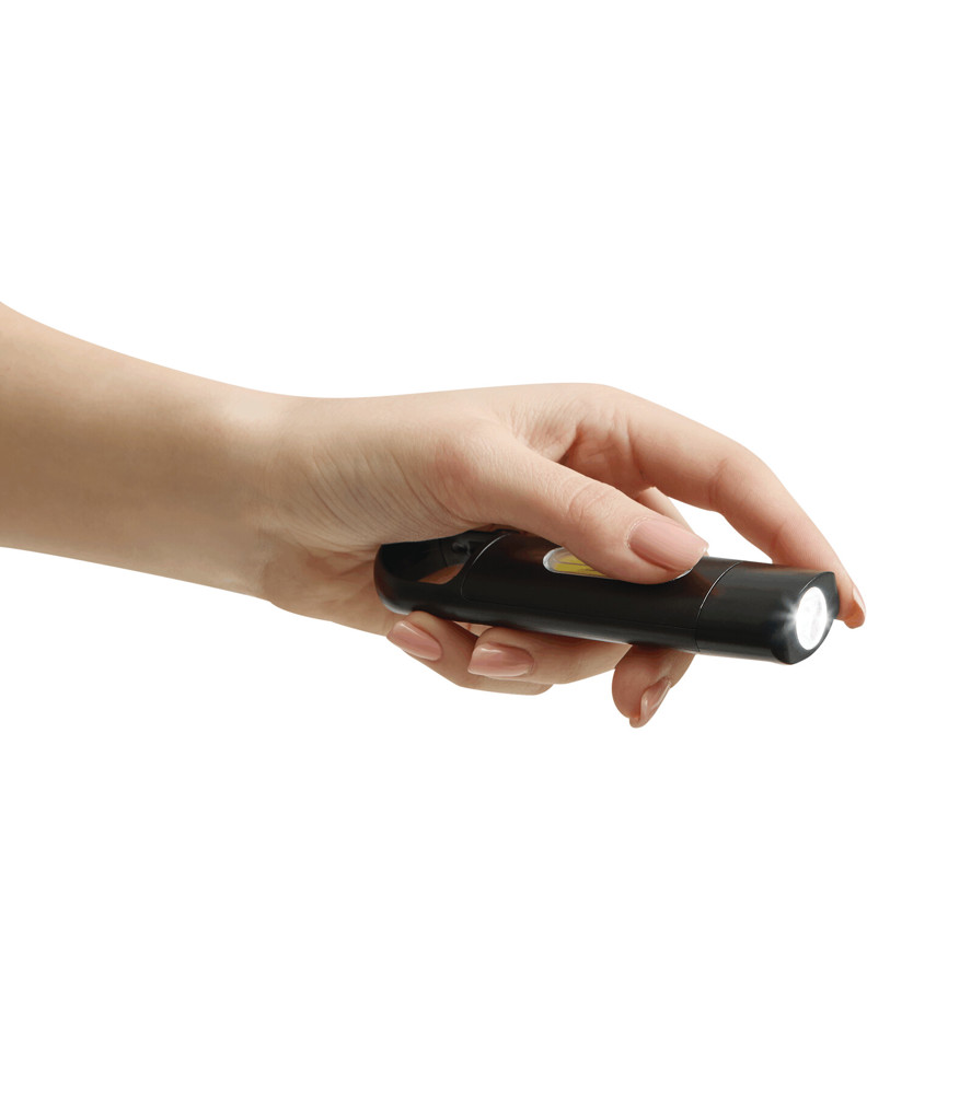 Aufladbare LED-Taschenlampe BRIGHT LIGHT: Front-LED mit 3 Leucht-Modi (100% und 75% Dauerlicht, Blinklicht), COB-Feld mit 10 lichtstarken weißen LED auf der Oberseite, gummierter An- und Ausschalter, mit Karabinerhaken zum Befestigen (der Karabiner ist NICHT als Sicherung beim Klettern geeignet), leistungsstarker Lithium-Akku, Kapazität: 200 mAh, inkl. USB-Ladekabel mit USB Typ C Stecker (Länge ca. 30 cm), in Box