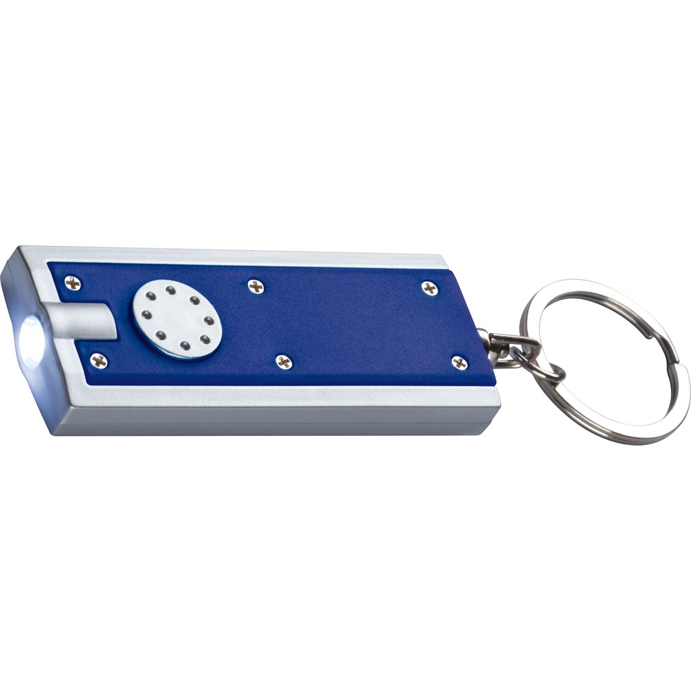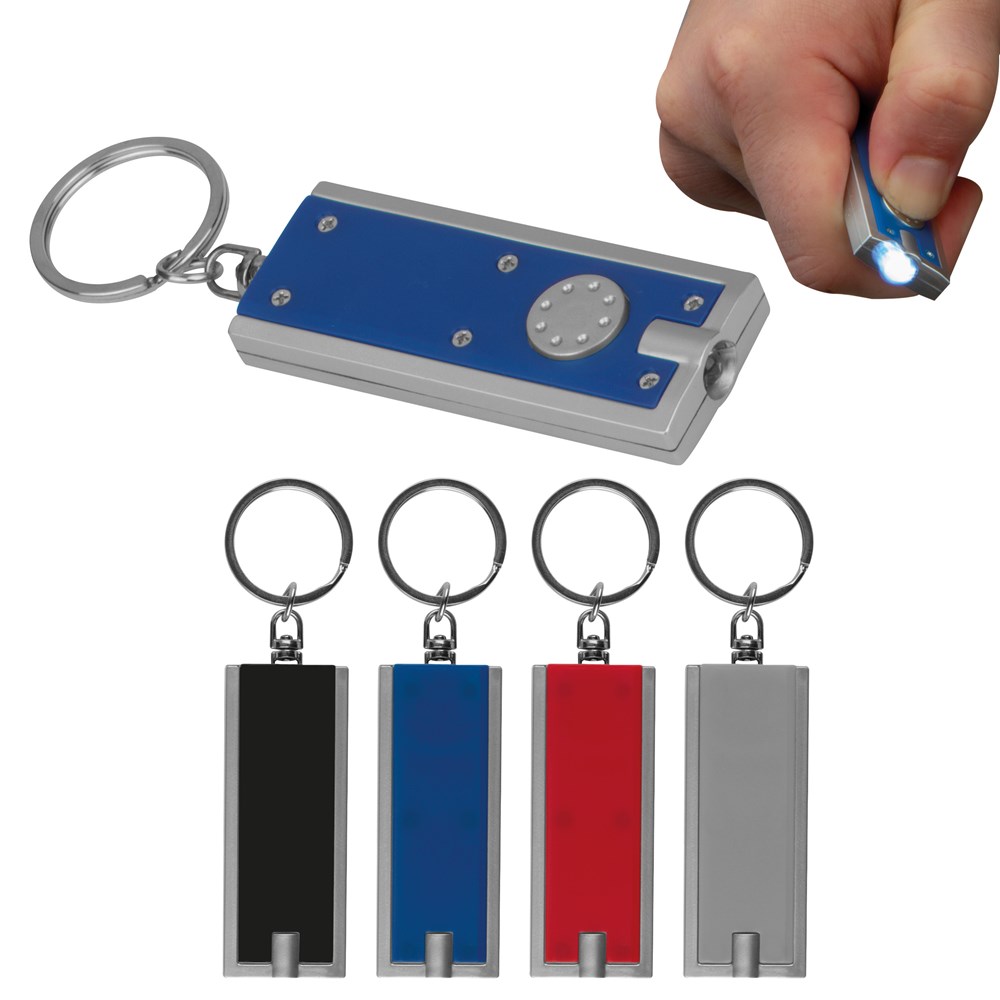 Rechteckiger Schlüsselanhänger mit integriertem LED Lämpchen und Schlüsselring aus Metall. Zwei Knopfzellen sind im Lieferumfang bereits enthalten. Ihre Werbung drucken wir auf die Seite gegenüber des Druckknopfes.